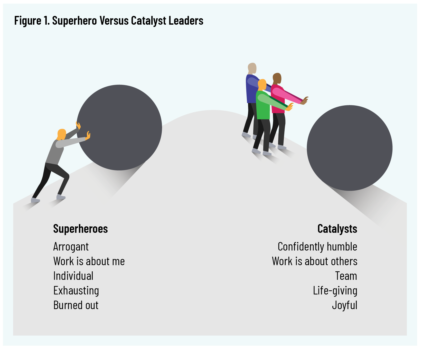 We regularly hear school leaders speak of confusion, inaction, frustration, unsustainability, friction, and burnout. School mission statements can sound hollow and incoherent. To cope and even to thrive in our current context, Christian independent schools don’t need superhero leaders who try to respond to these challenges single-handedly. This leads only to burnout for them and frustration for others. Instead, we need leaders to serve as catalysts. In chemistry, a catalyst accelerates a reaction without being used up. Catalyst leaders accelerate good work in ways that are sustainable, because the work is not about them. Catalysts tap others’ expertise, look for steps that can be eliminated, and try to find an easier way that serves more people. Figure 1 demonstrates the difference between leaders who attempt to function as superheroes and as catalysts.