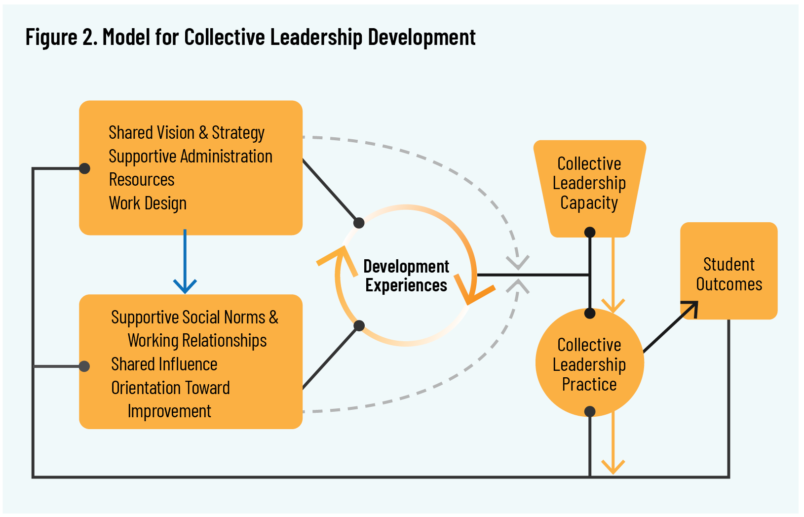 The conditions in the upper box precede those in the lower box. The seven conditions influence the development experience in two ways. First, the black lines from the conditions feed the experiences. For example, in a school with a shared vision and an administrative team that supports the well-being of teachers and students, improving student well-being is likely to be more attainable than in a school where those conditions are lacking. Second, the dotted lines after the experiences either catalyze or diminish the effects of the experiences. To continue with the example, supportive administrators can accelerate good work that comes out of the well-being development experience by sharing power with teachers who will lead the work across classrooms, or they can diminish the work by under-cutting efforts due to fear of a loss of power. Depending on the strength of the development experience and the supporting conditions, schools will experience increases in collective-leadership capacity, which improves leadership practices that enhance student outcomes. Those outcomes then influence leadership practices and the seven conditions that support development, as the returning black lines indicate. Collective leadership is inclusive and iterative by design.
