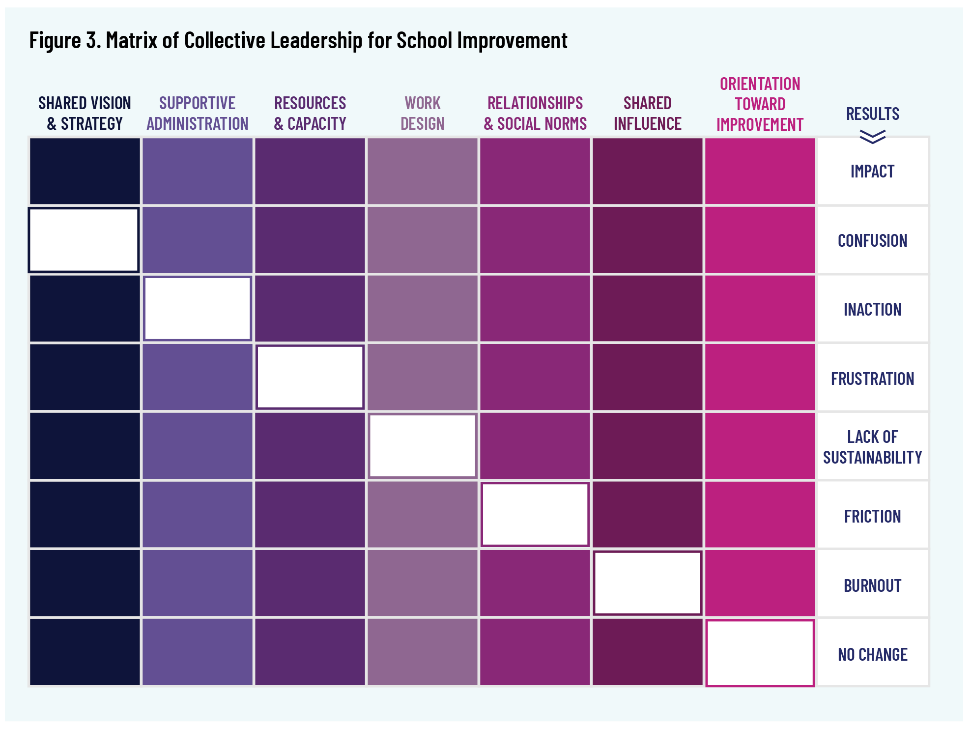 In schools that we work with, we often introduce collective leadership with the depiction shown in figure 3. Starting with the column on the right, labelled “Results,” we ask school leaders to identify which word best describes their school. If they are at “Impact,” this means that they are meeting their entire mission and each student is thriving. If all seven conditions are in fact present, then “Impact” is possible, although rare. Typically, school leaders choose another word or phrase. Whichever one they choose, together we look back across the row to see which condition is missing. If they choose the word “Burnout,” for example, then the hypothesis is that burnout results from a lack of shared influence. Certainly, the conditions influence one another, but the matrix begins to give school leaders insight for where they most need to improve.