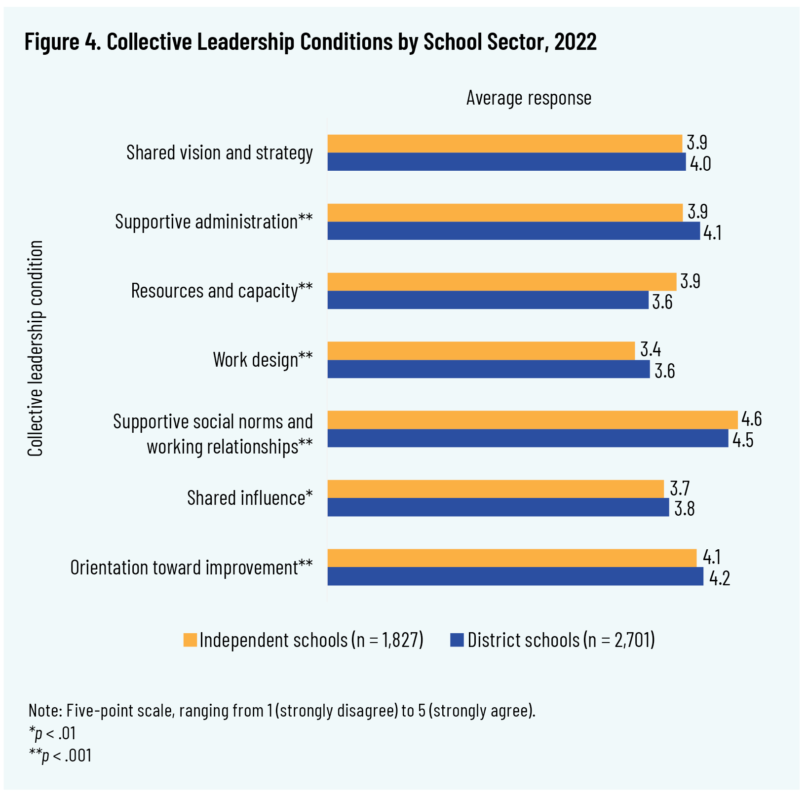 • There was no statistically significant difference for shared vision and strategy across respondents from district and independent schools. We assumed that Christian schools (forty-one of the forty-two independent schools surveyed) that shared a similar faith mission would be more aligned on a shared vision and strategy than other kinds of schools, but that was not the case. As with all the conditions, the responses were overwhelmingly positive, however, which might be due in part to the fact that all the schools that participated in the survey had already expressed some interest in collective leadership to improve their schools.