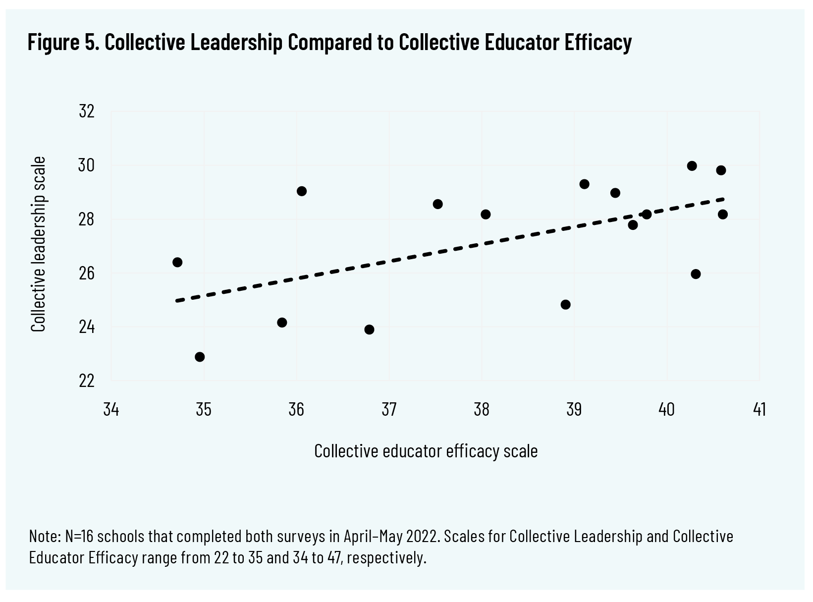 Our most recent analysis of data from sixteen district schools has found a strong correlation between collective leadership and collective teacher efficacy, based on two separate surveys given within one month of each other (see figure 5). 19 19 For a more detailed analysis of these data, see my forthcoming peer-reviewed paper.  Additionally, each of the seven conditions has a moderate to strong correlation with collective teacher efficacy. These findings need to be replicated in independent schools, but for the first time, we have been able to connect the more distant influence of collective leadership to the more proximate benefit of collective teacher efficacy, which is likely to lead to improved student outcomes.
