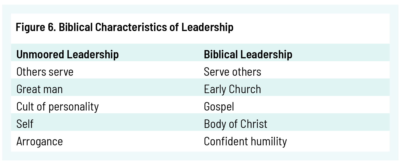 Figure 6 contrasts leadership that is unmoored and leadership that demonstrates biblical characteristics.