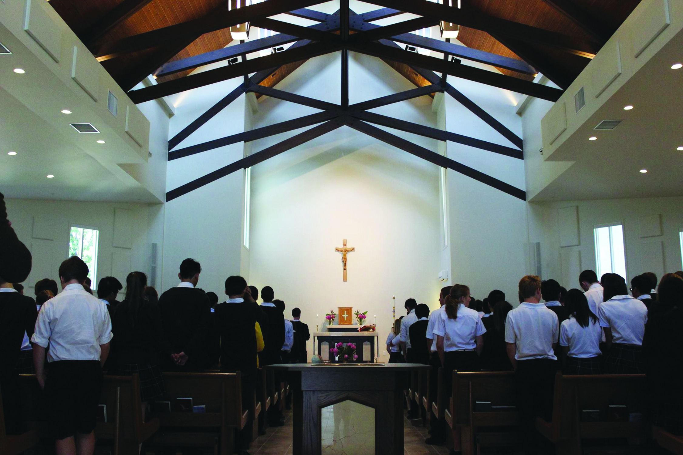 According to these teachers, sustaining a vibrant community of faith requires a deep understanding that students’ spiritual lives cannot be separated from their thoughts, words, and actions. “We are teaching the students that faith does not just occur within the walls of the church or in our school. It is a way of life.” A common goal of all school activities is connecting students to each other and to Christ. The whole school community prays together to open the school day, at lunch, and to close the day. The staff hold a daily prayer time, which is not mandatory but which many participate in. Club and team prayer at the start of meetings or games binds smaller groups together and unites them in purpose. The school’s chapel is open to students and staff, providing a space for prayer and meditation. Monthly Masses, in which all students and staff participate along with parents and parishioners who are able to attend, unite the community through word, sacrament, and relationship.