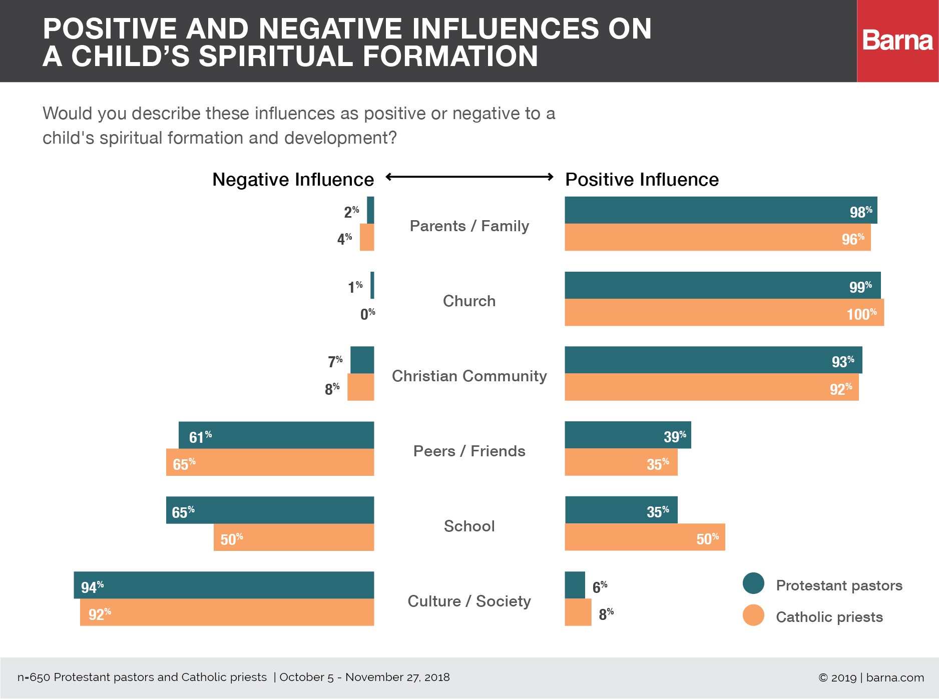 But at the same time, while a principled pluralism sees value in plurality, it also understands the need for important conversations around its limitations and challenges. If faith spaces, at their best, are to play a key role in a new civic vision, then it is necessary to engage deeply and honestly with faith leaders themselves to understand how they envision their civic role in the current context. Are they having key conversations about this, building relationships and trust in and beyond their own communities? Keen to probe these questions, Cardus in partnership with Barna Research recently conducted a survey of 650 Protestant and Catholic clergy to gather their perceptions and experiences of education, child development, and spiritual formation. Perhaps the most important finding from the survey is that churches, parents, and schools are not speaking to one another on these important matters nearly enough. In fact, our data points to disconnected and stifled conversations, both within and between these spaces. Church leaders universally agree that family has the most significant influence on a child’s development and spiritual formation and that churches play a secondary role. Both Protestant and Catholic leaders perceive schools—alongside peers—as having a largely negative influence on a child’s spiritual formation and development. Christian community is ranked by pastors as having the least amount of influence in either a positive or negative direction.