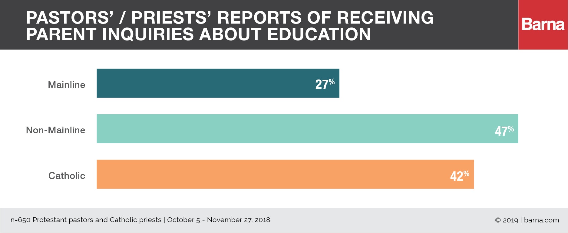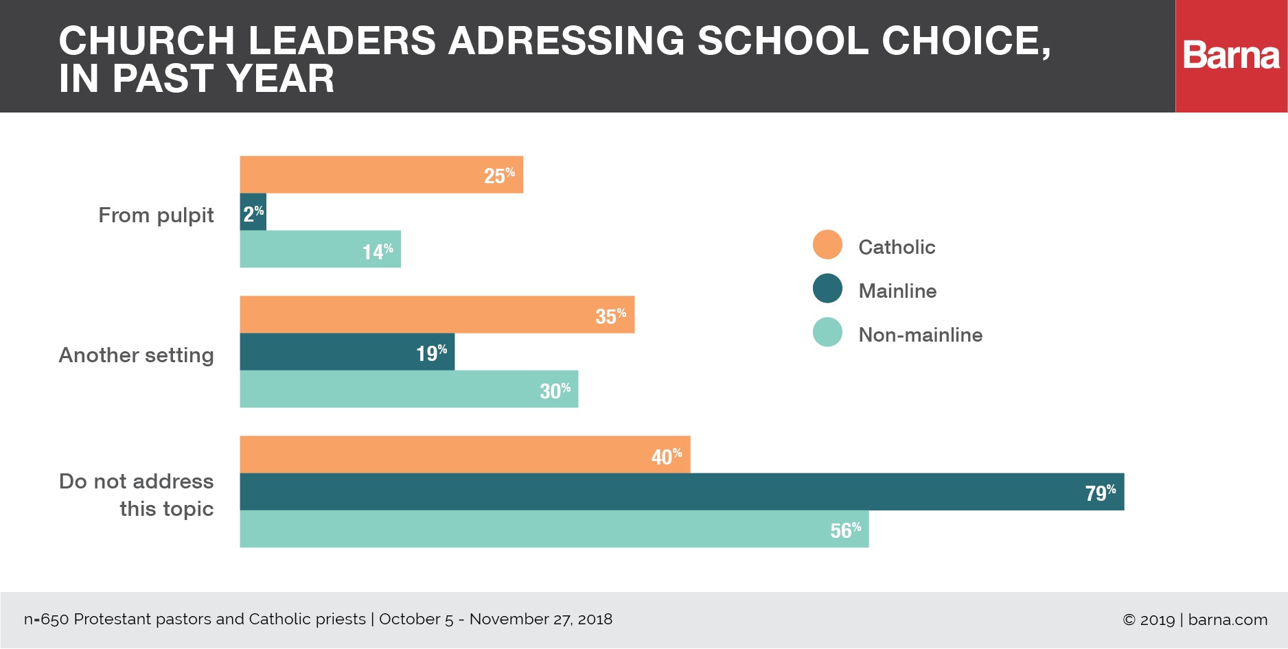 Yet despite these perceptions, the majority of Protestant churches have never been associated with a school, and the majority of both Protestant and Catholic clergy have not been asked by a parent for an opinion on what school might be best for their child. Moreover, of those Protestant pastors who have been approached over the past year, just 48 percent said they recommended an independent Christian school, citing affordability as a main concern. Only 2 percent of mainline Protestant and 14 percent of non-mainline pastors have addressed school choice from the pulpit in the past year, though 19 percent of mainline and 30 percent of non-mainline pastors have addressed this in another setting.