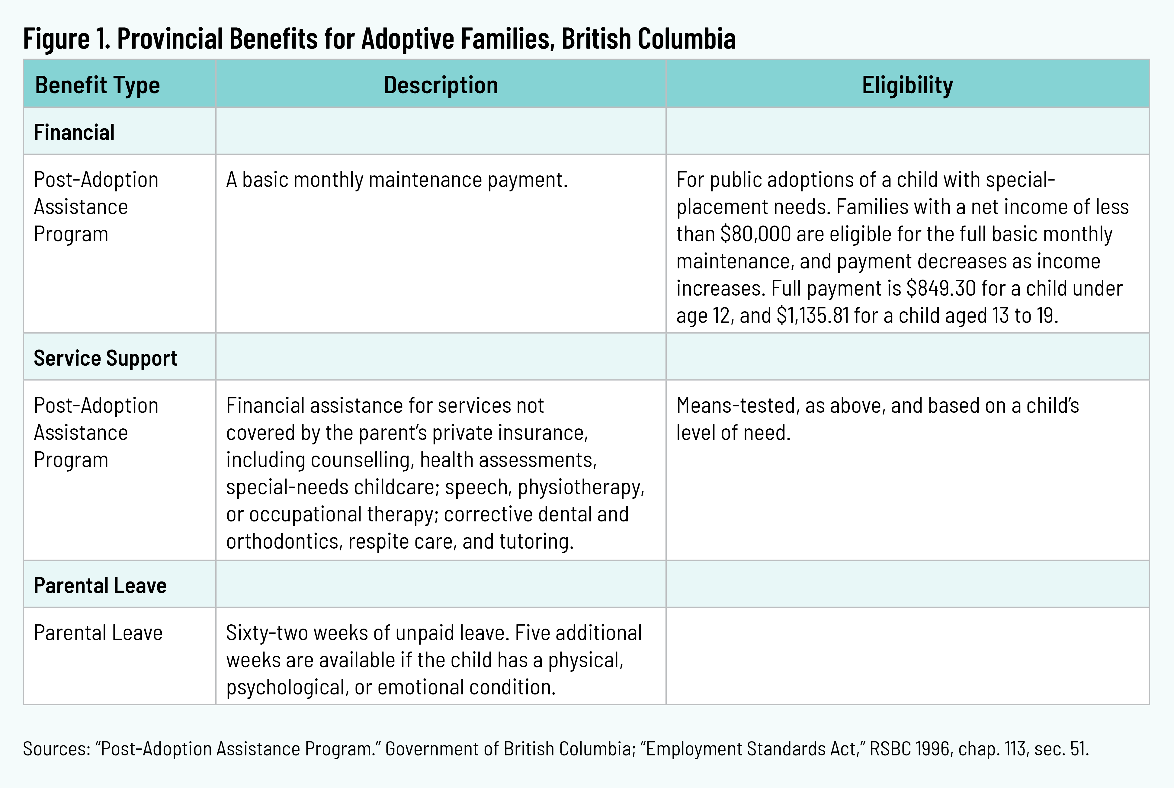 British Columbia placed about 114 children in adoptive homes in 2022–23. 4 4 “Adoption Services, Case Data and Trends,” Government of British Columbia, last modified January 18, 2024, https://mcfd.gov.bc.ca/reporting/services/adoption-services/case-data-and-trends. The province offers a Post-Adoption Assistance Program for children who have been placed through public adoption. Parents may qualify for a means-tested maintenance subsidy. 5 5 “Post-Adoption Assistance Program,” Government of British Columbia, last modified April 4, 2023, https://www2.gov.bc.ca/gov/content/life-events/birth-adoption/adoptions/how-to-adopt-a-child/adopt-from-foster-care/post-adoption-assistance-program. Eligible families may also receive financial assistance for specific health services not covered by the adoptive parent’s health benefits, such as counselling, respite care, special equipment needs, speech therapy, and physio and occupational therapies. The benefits are means-tested and consider the child’s level of need. 6 6 “Post-Adoption Assistance Program.” Parental leave is sixty-two weeks, unpaid. This leave can be extended an additional five weeks if the child has a physical, psychological, or emotional condition. 7 7 “Employment Standards Act,” sec. 51, “Parental Leave.” RSBC 1996, ch. 113, https://www.bclaws.gov.bc.ca/civix/document/id/complete/statreg/00_96113_01#section51.