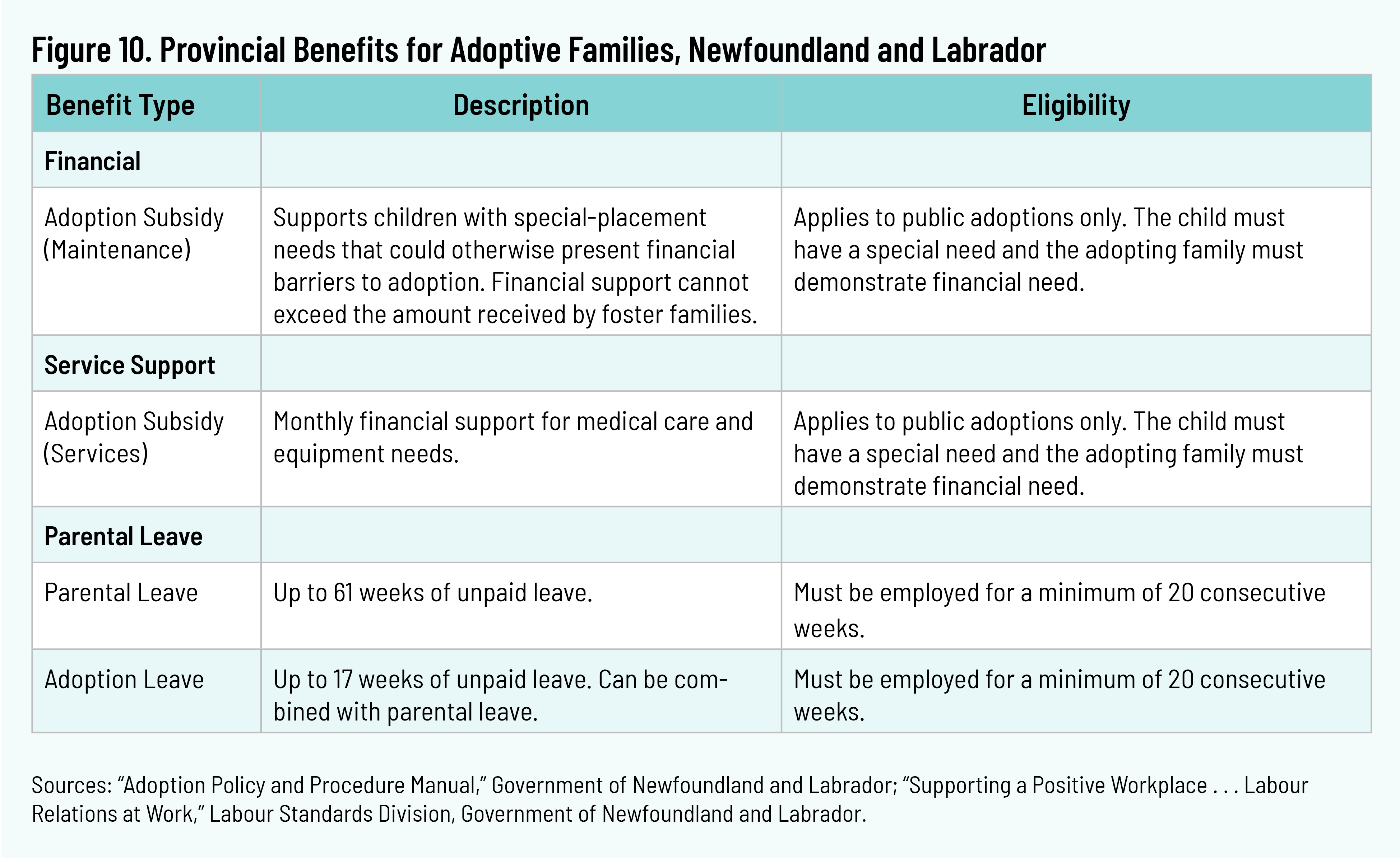 Families adopting in the public system may be eligible for a monthly maintenance payment in exceptional circumstances, in which the placement of the child would cause undue financial hardship that would prevent the adoption. Eligible circumstances may include children who are part of a sibling group, where a child has already formed an attachment with the prospective adoptive parent(s), or where the child is Indigenous and the benefit would facilitate a cultural or community placement. The amount cannot exceed the level of support provided for children in foster care. The province may also provide a subsidy for medical services and equipment, with these subsidy agreements negotiated prior to the adoption. 36 36 “Adoption Policy and Procedure Manual,” Government of Newfoundland and Labrador, October 28, 2022, https://www.gov.nl.ca/cssd/files/Adoption-Policy-and-Procedures-Manual.pdf. The province offers parental leave and adoption leave. Parental leave is sixty-one weeks, unpaid, and adoption leave is seventeen weeks, unpaid, and can be combined with parental leave. To have access to either of these types of leave, the parent must have been employed previously for twenty consecutive weeks.