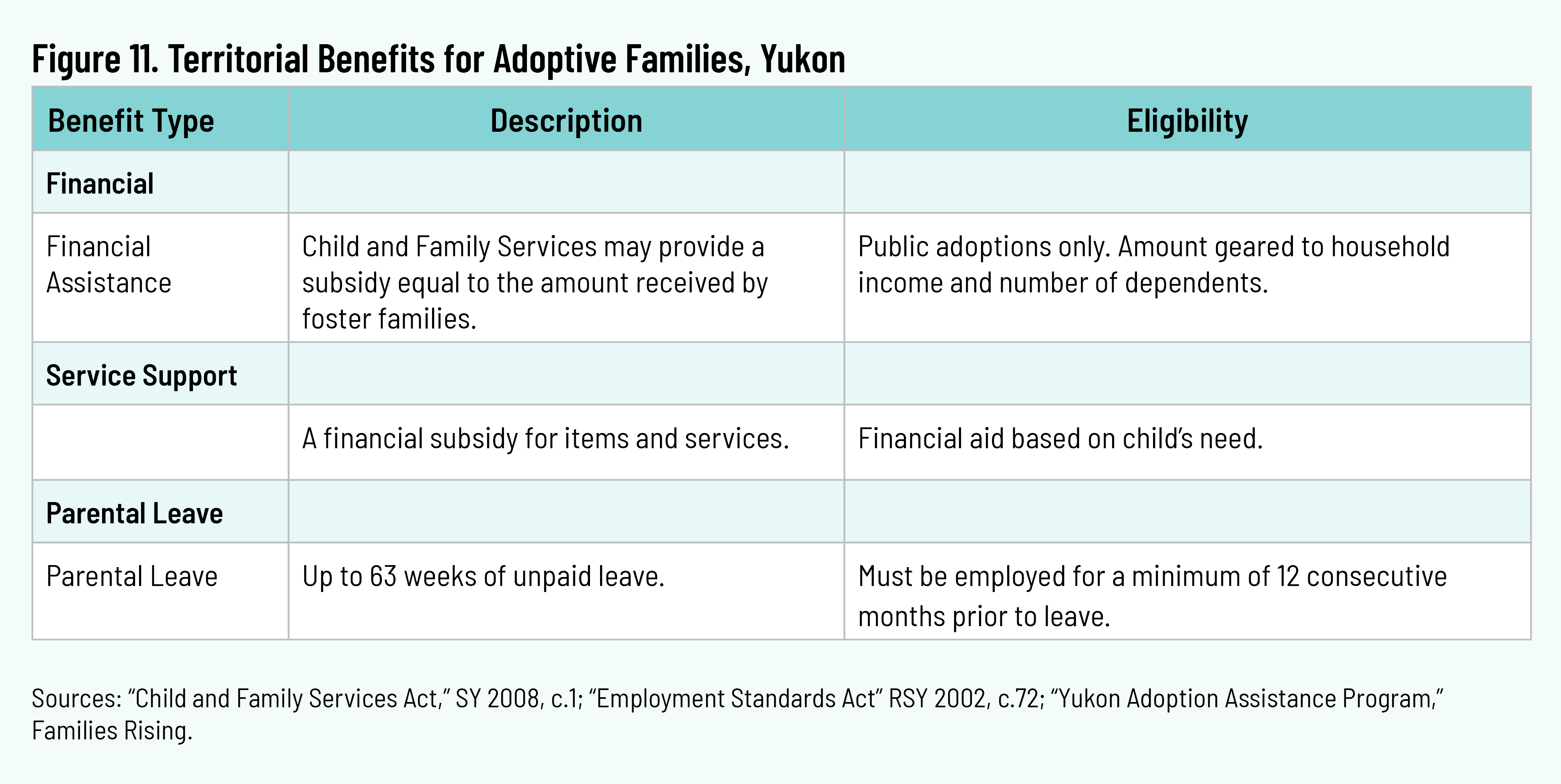 Yukon may provide an adoption subsidy for public adoptions equal to the foster-care maintenance rate. The amount is based on household income and number of dependents. The territory also provides funding for items intended to meet the special needs of the child. Aid must be determined to be in the best interests of the child. 37 37 “Yukon Adoption Assistance Program,” Families Rising, n.d., https://wearefamiliesrising.org/adoption-assistance/yukon-adoption-assistance-program/; “Child and Family Services Act,” SY 2008, chap. 1, part 5, https://canlii.ca/t/8mv2. Parental leave is sixty-three weeks, unpaid, with a minimum requirement of twelve months of continuous employment to qualify. 38 38 “Employment Standards Act,” RSY 2002, chap. 72, part 6, https://laws.yukon.ca/cms/images/LEGISLATION/PRINCIPAL/2002/2002-0072/2002-0072.pdf.