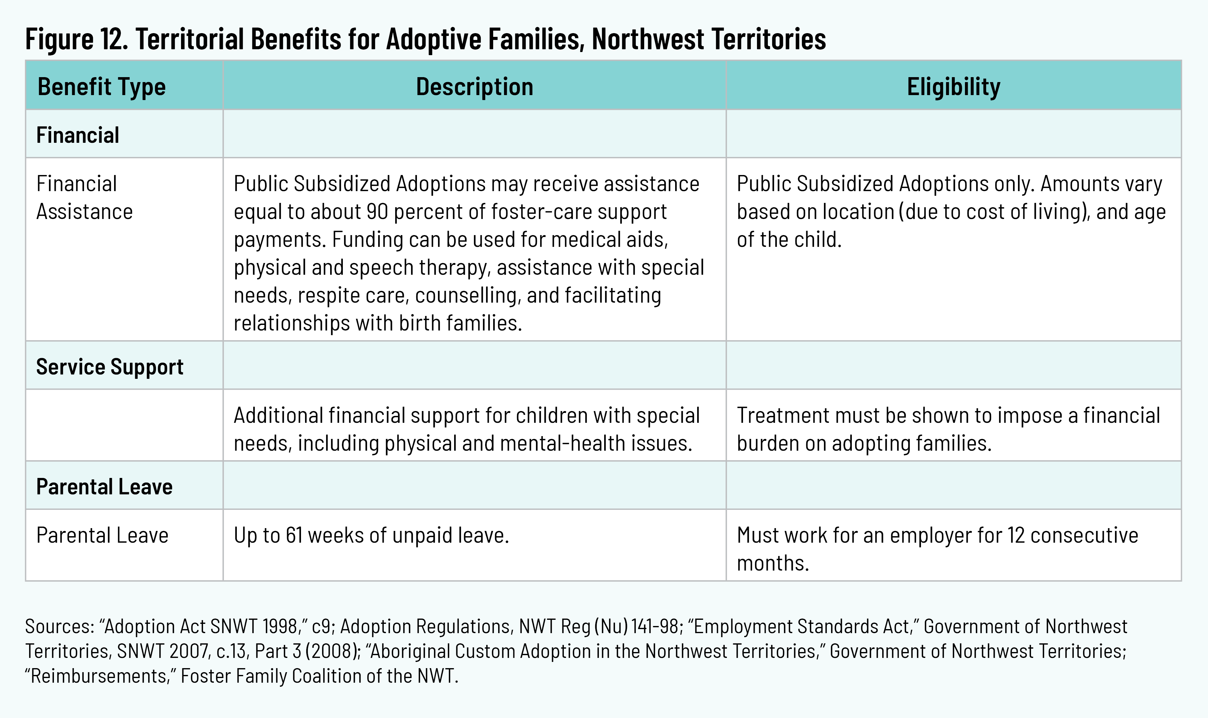 In 2022–23 there were thirty adoptions in the Northwest Territories, of which twenty-nine were facilitated through Indigenous communities under the Aboriginal Custom Adoption Recognition Act. 39 39 “2022–2023 Annual Report,” Director of Child and Family Services, Government of Northwest Territories, October 1, 2003, p. 39, https://www.hss.gov.nt.ca/sites/hss/files/resources/2022-2023-cfs-director-report.pdf. These adoptions are between Indigenous families who apply for certification from an Adoption Commissioner nominated by a local Aboriginal organization. 40 40 “Aboriginal Custom Adoption in the Northwest Territories,” Government of Northwest Territories, n.d., https://www.hss.gov.nt.ca/sites/hss/files/custom_adoption.pdf. Public Subsidized Adoptions can receive financial support equal to 90 percent of the foster-care maintenance payment. Amounts vary based on location (due to cost of living) and age of the child. Additional amounts are available for children with physical or mental health conditions requiring treatment that imposes a financial burden on adoptive parents. 41 41 “Per Diem Rates for Foster Caregivers and Subsidized Adoptions,” Foster Family Coalition of the NWT, n.d., https://www.ffcnwt.com/reimbursements; “Consolidation of Adoption Regulations,” R-141-98 (1998), https://canlii.ca/t/8kk5; “Adoption Act,” SNWT 1998, chap. 9, sec. 41, https://www.justice.gov.nt.ca/en/files/legislation/adoption/adoption.a.pdf. Parents are eligible for sixty-one weeks of unpaid leave when they have worked for an employer for at least twelve consecutive months. 42 42 “Employment Standards Act,” SNWT 2007, chap.13, part 3 (2008), https://www.justice.gov.nt.ca/en/files/legislation/employment-standards/employment-standards.a.pdf.