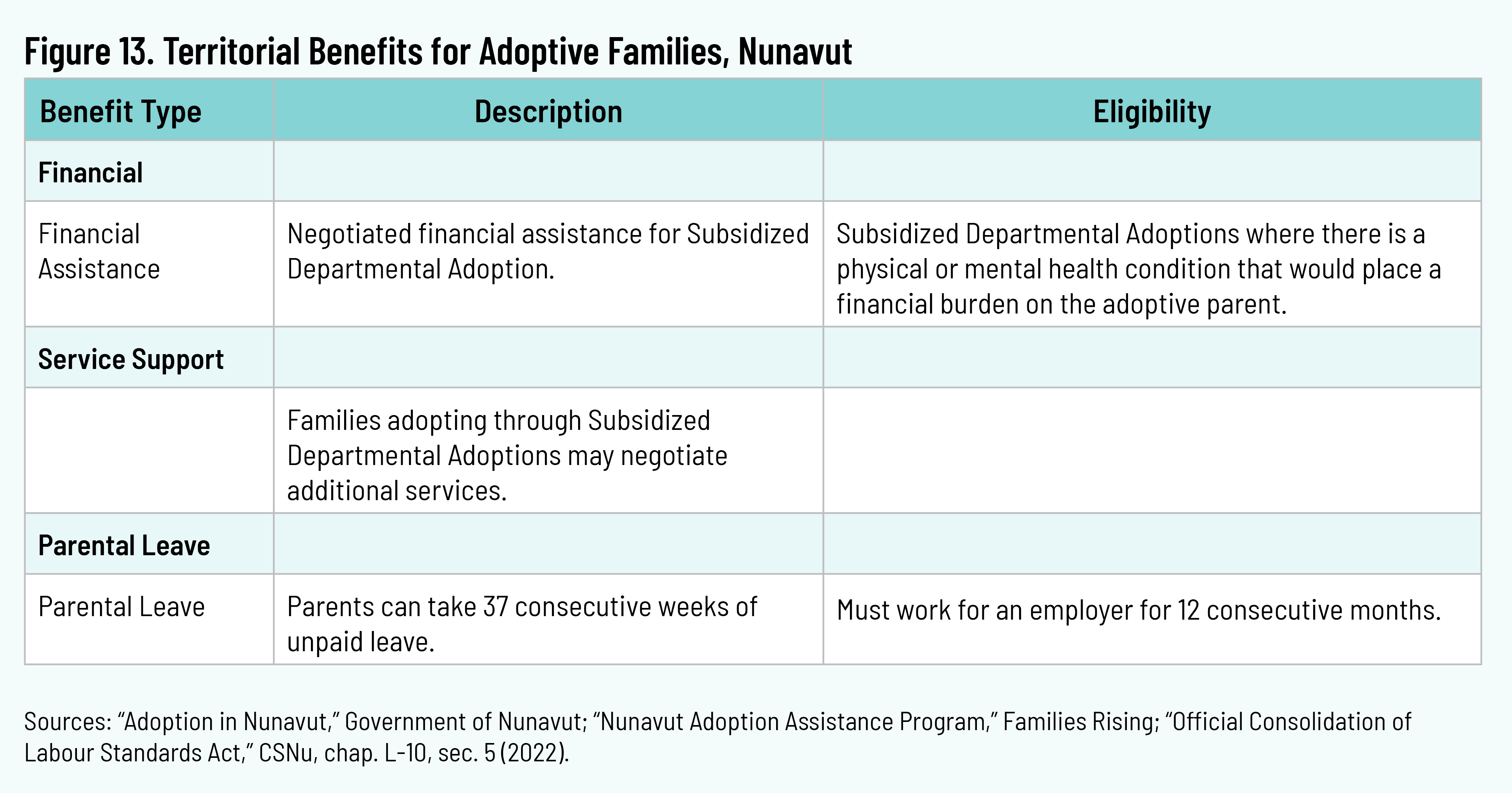 Financial assistance is available for Subsidized Departmental Adoptions of children in foster care. Assistance is available in cases in which a physical or mental condition, or basic care need, would place a financial burden on the adoptive family. The subsidy amount is negotiated with adoptive parents and must be less than the foster-care maintenance amount. Additional services can be negotiated with adoptive families. 43 43 “Nunavut Adoption Assistance Program,” Families Rising, n.d., https://wearefamiliesrising.org/adoption-assistance/nunavut-adoption-assistance-program/; “Adoption in Nunavut,” Government of Nunavut, n.d., https://www.gov.nu.ca/en/families-parenting-elders-and-youth/adoption. Parents are eligible for thirty-seven weeks of unpaid leave when they have worked for an employer for at least twelve consecutive months. 44 44 “Official Consolidation of Labour Standards Act,” CSNu, chap. L-10, sec. 5 (2022), https://www.nunavutlegislation.ca/en/consolidated-law/labour-standards-act-official-consolidation.