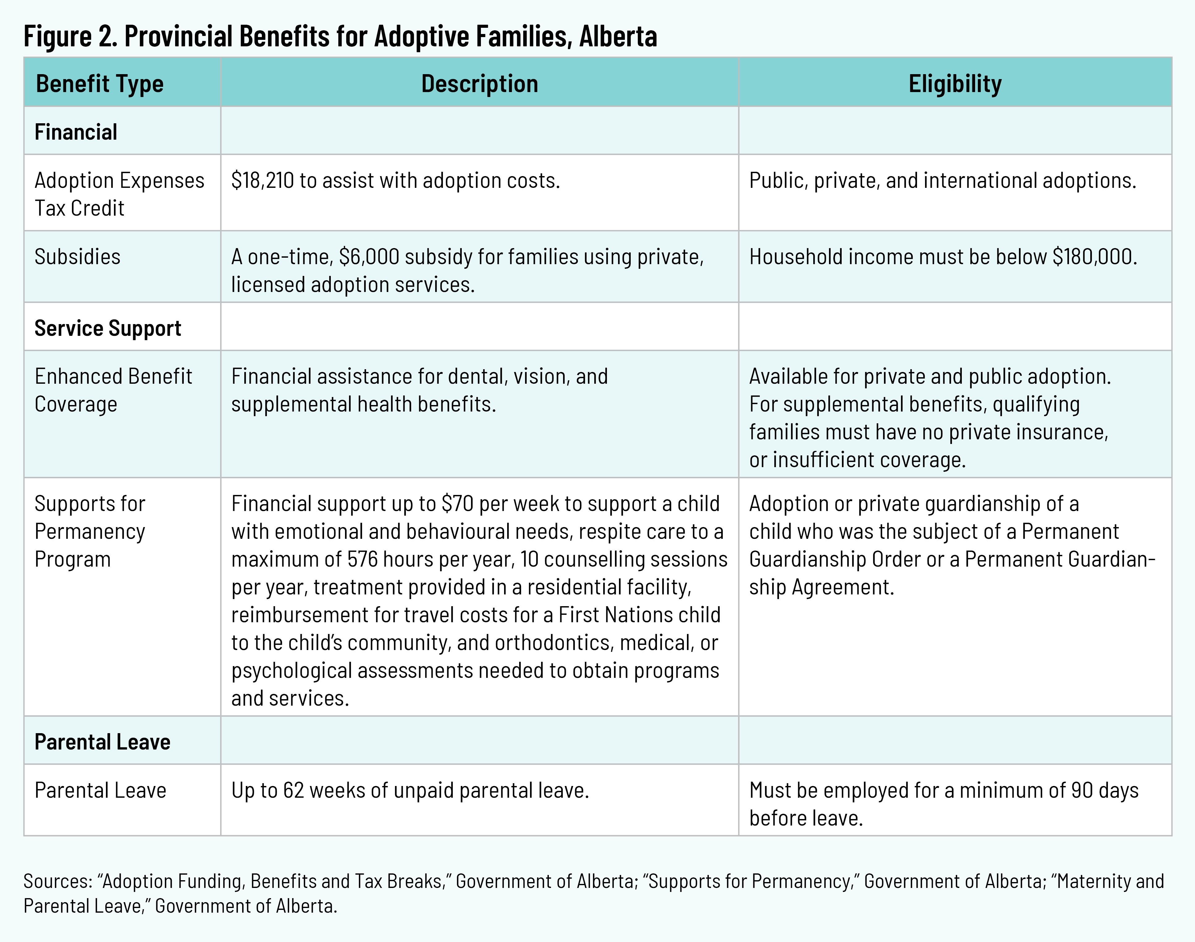 During the 2022–23 fiscal year, 158 public adoptions were completed in Alberta. 8 8 “Adoption Statistics,” Government of Alberta, n.d., https://www.alberta.ca/adoption-statistics. The province offers a provincial Adoption Expenses Tax Credit that mirrors the federal credit. Adoptive parents can claim up to $18,210 in expenses for public, private, and international adoptions. 9 9 “Adoption Funding, Benefits and Tax Breaks,” Government of Alberta, n.d., https://www.alberta.ca/adoption-funding-benefits-and-tax-breaks. In addition, those with a household income below $180,000 per year can receive a one-time subsidy of $6,000 to cover the cost of private adoption. 10 10 “Adoption Funding, Benefits and Tax Breaks.” For children adopted from foster care, the province offers financial support to help with emotional or behavioural needs, counselling, medical needs, and respite care. 11 11 “Supports for Permanency,” Government of Alberta, n.d., https://www.alberta.ca/supports-for-permanency. The province also offers enhanced benefits coverage for the cost of dental, vision, and other health needs, which can be claimed for public, private, and international adoptions through a licensed agency. 12 12 “Adoption Funding, Benefits and Tax Breaks.” Parents may take sixty-two weeks of unpaid leave if they have been employed for the previous ninety days. 13 13 “Maternity and Parental Leave,” Government of Alberta, n.d.