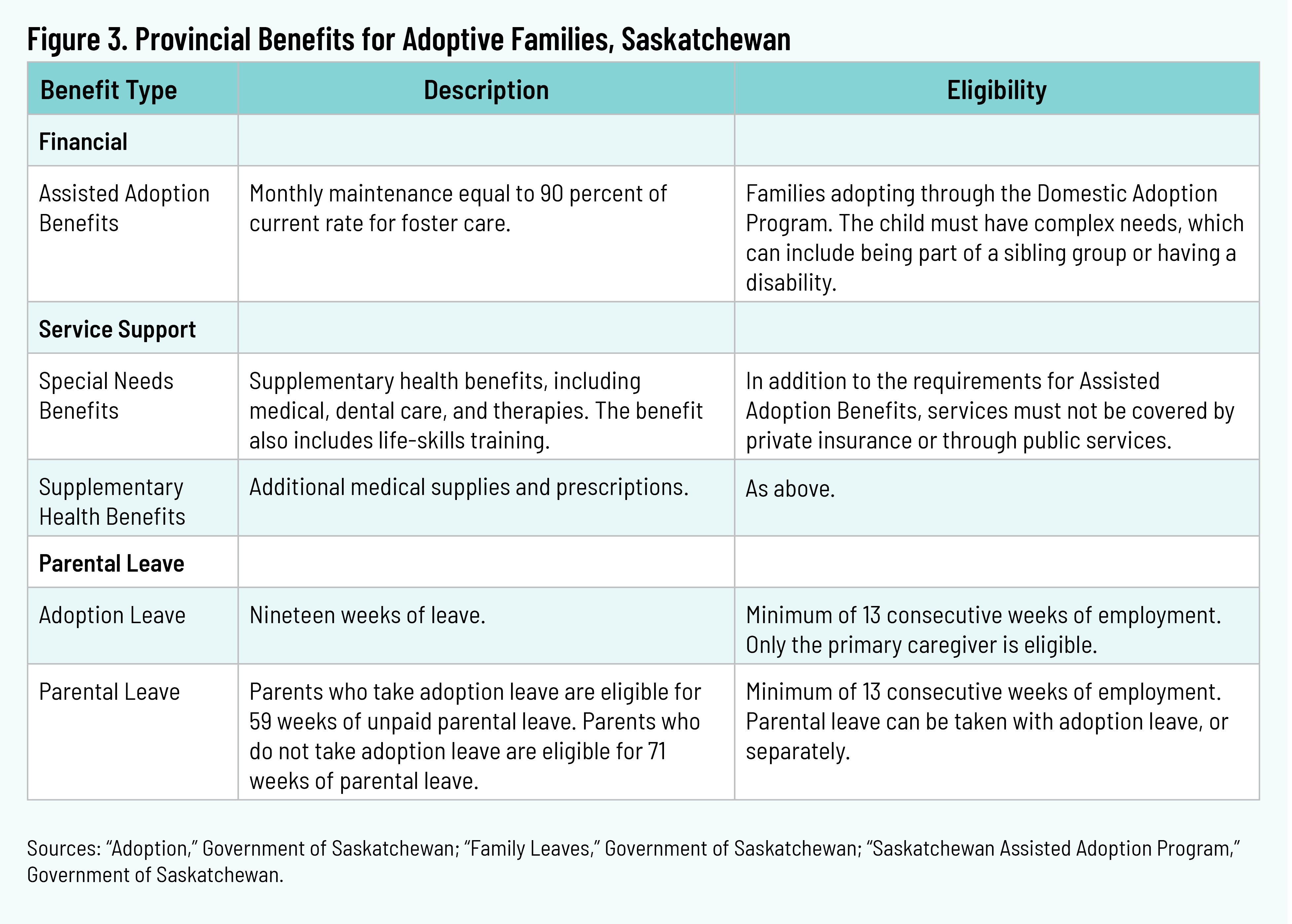 Parents adopting sibling groups or children with complex needs through the Domestic Adoption Program may apply for Assisted Adoption Benefits equal to 90 percent of the foster-care maintenance payment. Kin adoptions are also eligible. Parents may also apply for a Special Needs Benefit for health services not covered by insurance plans or public services, including therapies, medical supplies, and dental treatment. The Special Needs Benefit also includes financial support for life-skills training. Children in foster care who are placed for adoption before an Order of Adoption has been granted by a court may be eligible for additional Supplementary Health Benefits, which covers items such as some prescription medicines, dental and optical services, and hearing services. 14 14 “Supplementary Health Benefits,” Government of Saskatchewan, n.d., https://www.saskatchewan.ca/residents/health/prescription-drug-plans-and-health-coverage/extended-benefits-and-drug-plan/supplementary-health-benefits; “Saskatchewan Assisted Adoption Program Factsheet,” Government of Saskatchewan, n.d., https://publications.saskatchewan.ca/#/products/78861. The province offers unpaid adoptive leave for the primary parent in addition to a standard unpaid parental leave of sixty-three weeks. 15 15 “Family Leaves,” Government of Saskatchewan, n.d., https://www.saskatchewan.ca/business/employment-standards/job-protected-leaves/family-leaves.