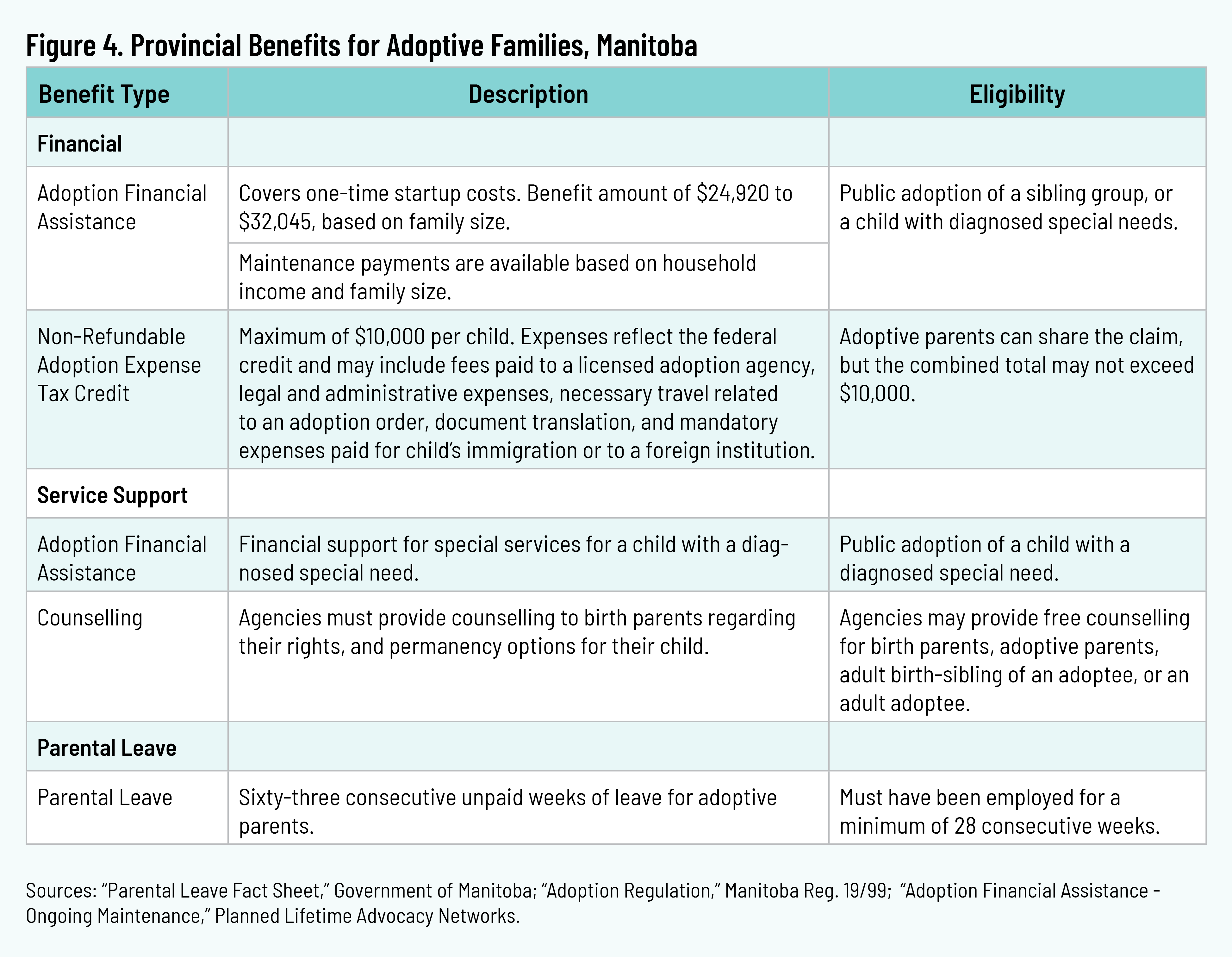 Manitoba completed eighty-two adoptions in fiscal year 2022–23 through Child and Family Services and private licensed agencies. 16 16 “Manitoba Families: Annual Report for the Year Ended March 31, 2023,” Government of Manitoba, September 1, 2003, p. 107, https://www.gov.mb.ca/fs/about/pubs/fsar-2022-2023.pdf. Parents adopting through Child and Family Services can receive financial assistance when adopting a sibling group or a child with special needs. This assistance can include a one-time payment for startup costs, ongoing support for special services, or maintenance costs. 17 17 “Adoption of a Permanent Ward,” Government of Manitoba, n.d., https://www.gov.mb.ca/fs/childfam/adopt_wards.html. The province also offers a Non-Refundable Adoption Expense Tax Credit available for public, private, and international adoptions. 18 18 “The Income Tax Act,” sec. 4.6(10.1) “Non-Refundable Tax Credits.” CCSM, chap. I10, https://web2.gov.mb.ca/laws/statutes/ccsm/i010.php?lang=en#4.6. Birth parents considering permanent-care options are provided with counselling. Adoptive parents may take sixty-three weeks of unpaid parental leave, though the province has a longer employment requirement compared to other provinces, at twenty-eight consecutive weeks. 19 19 “Parental Leave,” Government of Manitoba, January 1, 2022, https://www.gov.mb.ca/labour/standards/doc,parental-leave,factsheet.pdf.