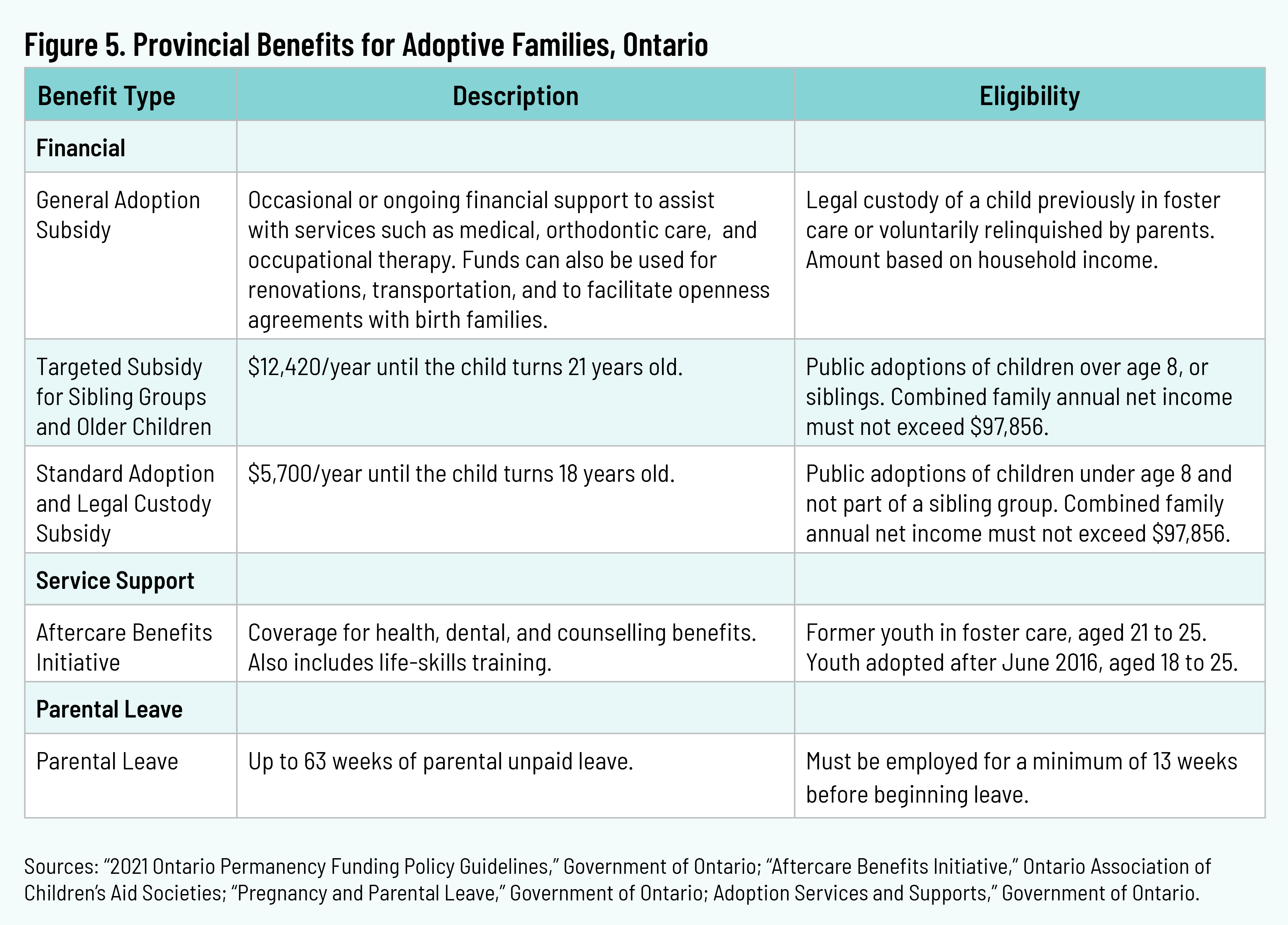 The most populous province in Canada oversaw 456 adoptions through child-welfare agencies in 2022–23. 20 20 “Adoption,” Ontario Association of Children’s Aid Societies, n.d., https://www.oacas.org/childrens-aid-child-protection/adoption/. Ontario provides various subsidies for families adopting from foster care, based on a number of criteria, including financial need. The General Adoption Subsidy provides occasional or ongoing assistance for specific services, to facilitate placements for sibling, cultural, or religious compatibility, and to accommodate open adoption orders where children maintain contact with their birth family. The Targeted Subsidy for Adoption and Legal Custody is for children over age eight and for sibling groups. Household income must not exceed $97,856 (as of October 2021). The Standard Adoption and Legal Custody Subsidy is based on financial need and geared to families adopting a child under age eight who is not part of a sibling group. Household income must not exceed $97,856 (as of October 2021). 21 21 “2021 Ontario Permanency Funding Policy Guidelines,” Government of Ontario, September 28, 2021, https://www.ontario.ca/document/child-protection-service-directives-forms-and-guidelines/2021-ontario-permanency-funding-policy-guidelines. The Aftercare Benefits Initiative offers coverage for prescriptions, extended health coverage, dental coverage, and life-skill training, to young adults under age twenty-six who were adopted from foster care. 22 22 “Services Delivered: Aftercare Benefits Initiative,” Government of Ontario, last updated May 23, 2023, https://www.ontario.ca/document/mccss-service-objectives-child-welfare-and-protection/services-delivered-aftercare. Parents can take up to sixty-three weeks of unpaid parental leave. 23 23 “Pregnancy and Parental Leave,” Government of Ontario, last updated June 13, 2024, https://www.ontario.ca/document/your-guide-employment-standards-act-0/pregnancy-and-parental-leave.