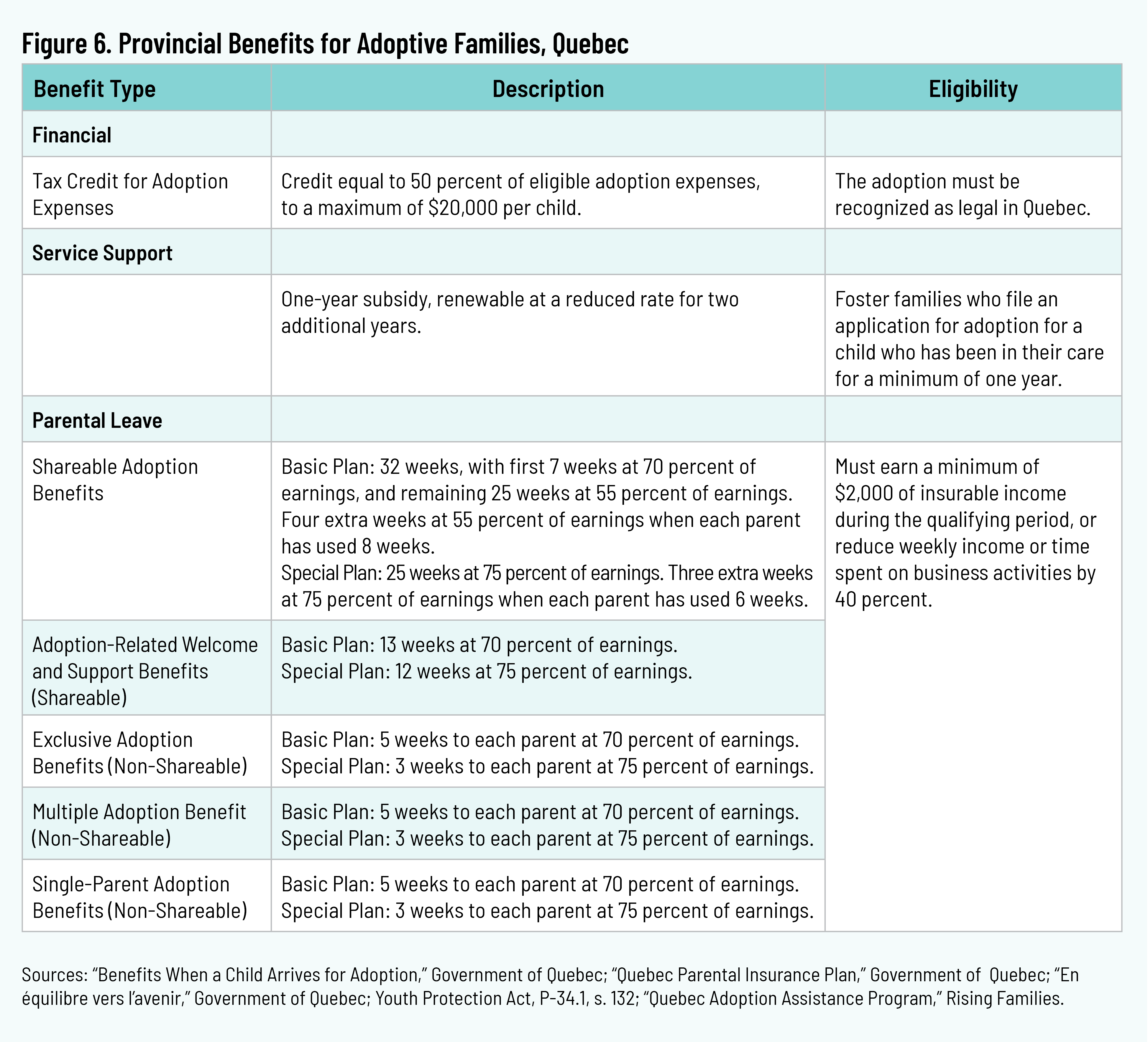 Quebec facilitated 216 public adoptions in 2022–23. 24 24 “En équilibre vers l’avenir,” Government of Quebec, 2003, p. 17, https://ciusss-centresudmtl.gouv.qc.ca/sites/ciussscsmtl/files/media/document/2022_2023_BilanDPJ.pdf. The province offers a Tax Credit for Adoption Expenses equal to 50 percent of eligible expenses to a maximum of $20,000. The province also provides a one-year subsidy to foster parents who wish to adopt a child who has been in their care for at least one year. The subsidy can be renewed for an additional two years, at a reduced rate. 25 25 “Youth Protection Act,” P-34.1, sec. 132 (n.d.), https://www.legisquebec.gouv.qc.ca/en/document/cr/P-34.1,%20r.%204; “Quebec Adoption Assistance Program,” Rising Families, n.d., https://wearefamiliesrising.org/adoption-assistance/quebec-adoption-assistance-profile/. Quebec administers a paid parental-leave program in place of the Federal Employment Insurance program, called the Quebec Parental Insurance Plan. This program offers benefits that can be shared between parents, and benefits that are non-shareable and exclusive to one parent. Parents can select a basic option or a special option, differentiated by the duration of leave. A combination of these benefits may be used, depending on the circumstances. 26 26 “Quebec Parental Insurance Plan,” Government of Quebec, n.d., https://www.rqap.gouv.qc.ca/en/wage-earner/adoption/benefits-child-adoption-after-january-2021.
