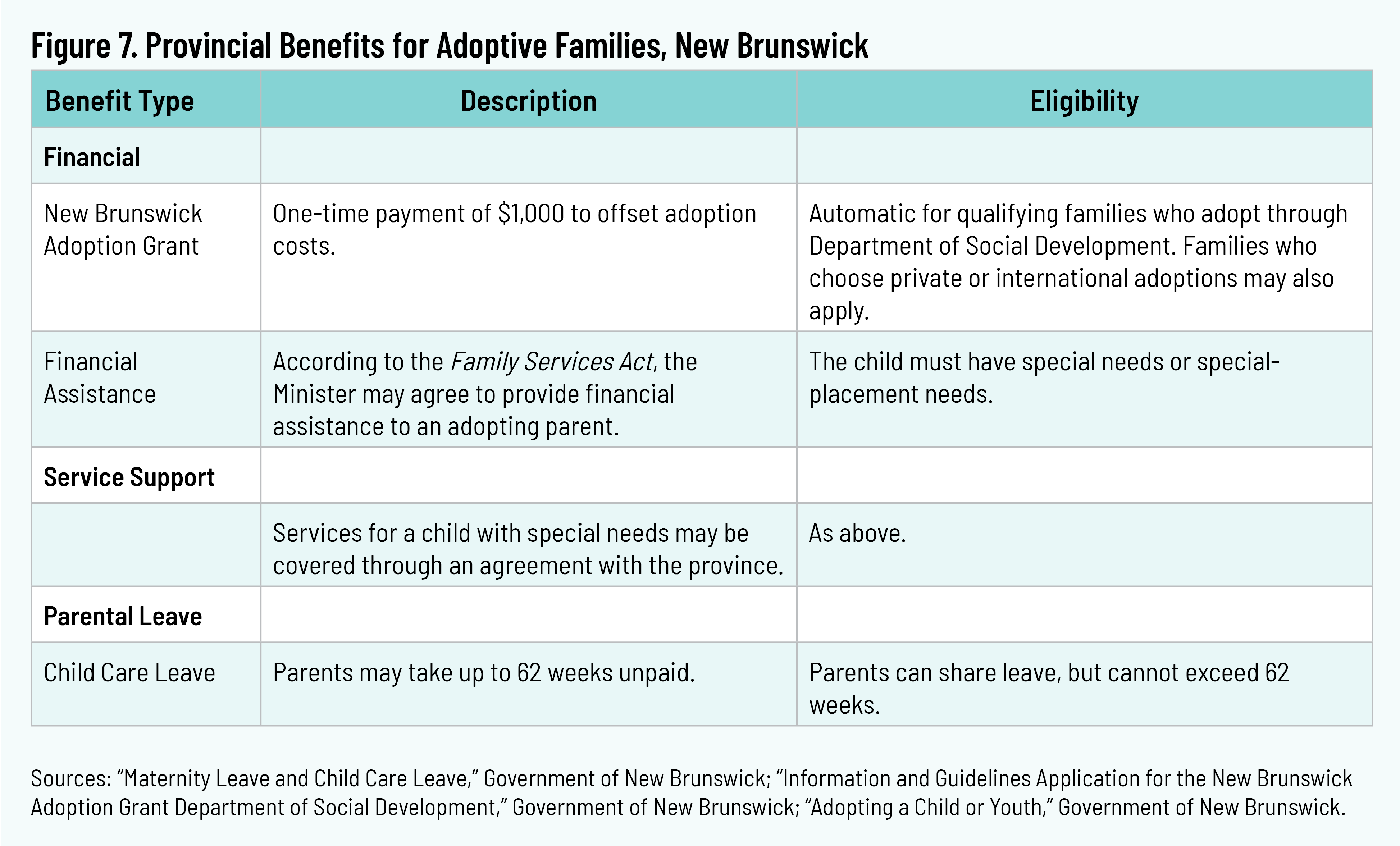New Brunswick provides adoptive parents with a one-time Adoption Grant of $1,000, to offset the costs associated with adoption. 27 27 “Information and Guidelines Application for the New Brunswick Adoption Grant Department of Social Development,” Government of New Brunswick, n.d., https://www2.gnb.ca/content/dam/gnb/Departments/sd-ds/pdf/adoption/InformationGuidelinesNBAdoptionGrant.pdf; “Frequently Asked Questions, Fostering or Adopting a Child or Youth,” Government of New Brunswick, last updated March 18, 2024, https://drupal.socialsupportsnb.ca//sites/default/files/2024-01/Fostering%20or%20adopting%20a%20child%20or%20youth%20-%20Frequently%20Asked%20Questions.pdf. The grant may be used for public, private, and international adoptions. If the child has special-service or placement needs, the province may provide additional financial assistance. 28 28 “Frequently Asked Questions, Fostering or Adopting a Child or Youth.” Adoptive parents are entitled to sixty-two weeks of unpaid leave. This leave may be shared between parents but cannot exceed sixty-two weeks. 29 29 “Maternity Leave and Child Care Leave,” Government of New Brunswick, 2018, https://www2.gnb.ca/content/dam/gnb/Departments/petl-epft/PDF/es/FactSheets/MaternityChildCareLeave.pdf.