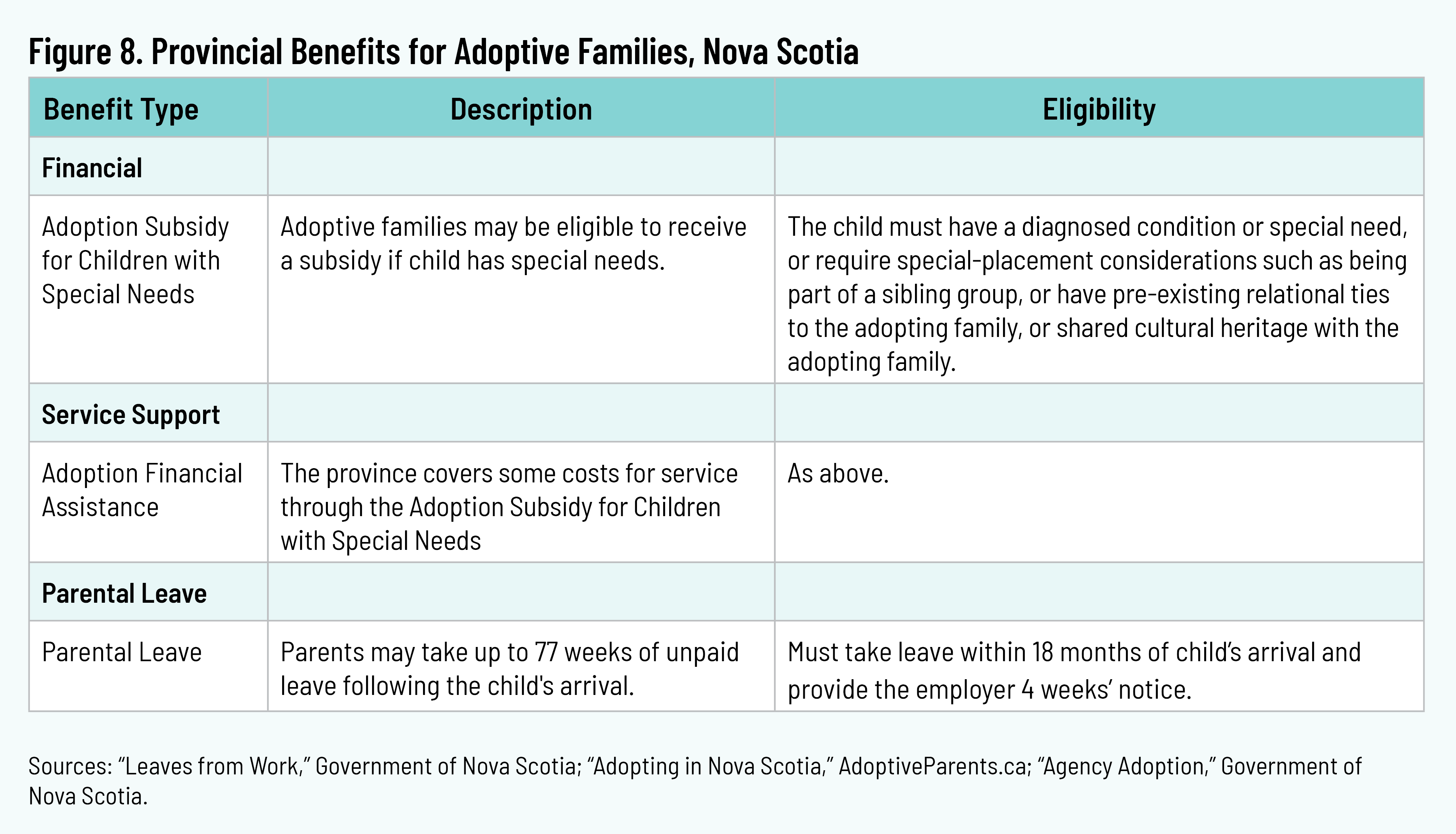 Nova Scotia provides a subsidy for public adoptions for children with diagnosed physical, mental, or behavioural needs or for children with a special-placement needs such as being part of a sibling group. 30 30 “Agency Adoption,” Government of Nova Scotia, 2011. Parents must request the subsidy from the Minister of Community Services. The province provides a longer parental leave compared to most other provinces: up to seventy-seven weeks of unpaid leave. 31 31 “Leaves from Work,” Government of Nova Scotia, n.d., https://novascotia.ca/lae/employmentrights/leaves.asp. Employees must have worked one year with the same employer to qualify.