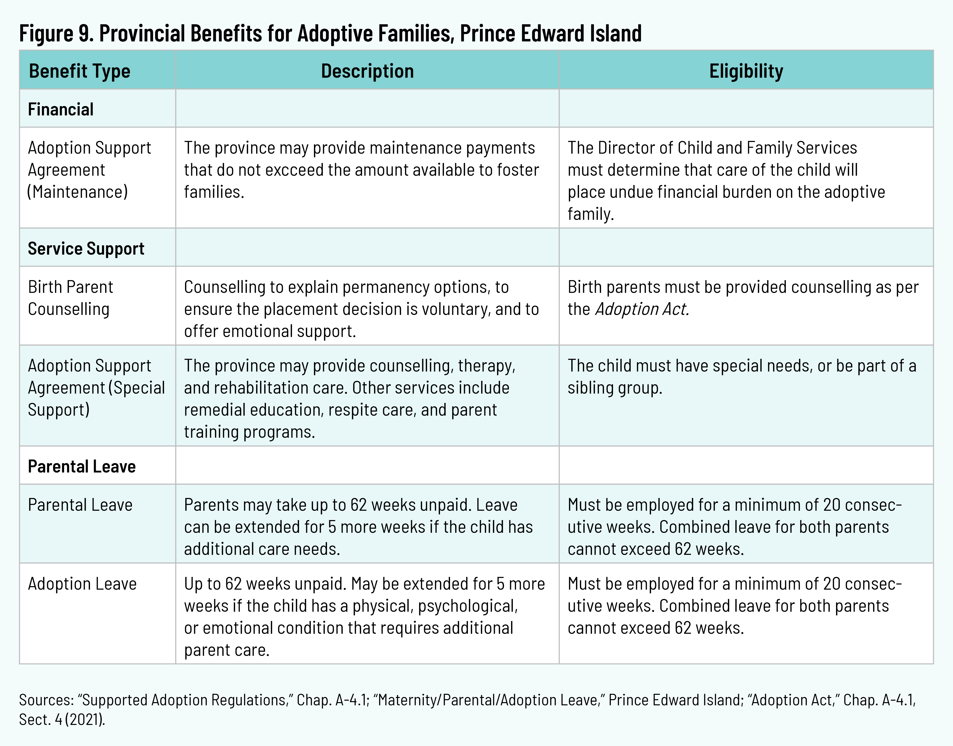 Prince Edward Island facilitated fourteen adoptions in 2021–22. 32 32 “Department of Social Development and Housing: Annual Report 2021–2022,” Prince Edward Island, January 2024, p. 10, https://www.princeedwardisland.ca/sites/default/files/publications/21-22_annual_report_final_web.pdf. Parents may request maintenance payments and/or special support. Eligibility for maintenance payments is determined by the Director of Child and Family Services, who must be satisfied that the care of the child will place an undue financial burden on the family. Payments must not exceed the amount available to foster families. Special-support payments are intended for medical expenses, transportation costs, or home renovations. This special support is granted only for public adoptions in which the child has special needs. Families adopting a child from foster care may also receive services such as counselling or therapy, remedial education, rehabilitation care, respite care, and parent training programs. 33 33 “Adoption Act Supported Adoption Regulations,” chap. A-4.1 (2006), https://www.princeedwardisland.ca/en/legislation/adoption-act/supported-adoption-regulations. The province provides free counselling for birth parents who are considering permanent care options for their child. 34 34 “Adoption Act,” chap. A-4.1, sec. 4 (2021), https://www.princeedwardisland.ca/en/legislation/adoption-act. Adoptive parents may take sixty-two weeks of unpaid parental or adoptive leave. To qualify, they must have been employed for the previous twenty weeks. Leave can be extended five additional weeks if the child has a physical, psychological, or emotional condition requiring additional parental care. 35 35 “Maternity/Parental/Adoption Leave,” Prince Edward Island, last updated March 1, 2023, https://www.princeedwardisland.ca/en/information/workforce-advanced-learning-and-population/maternityparentaladoption-leave.