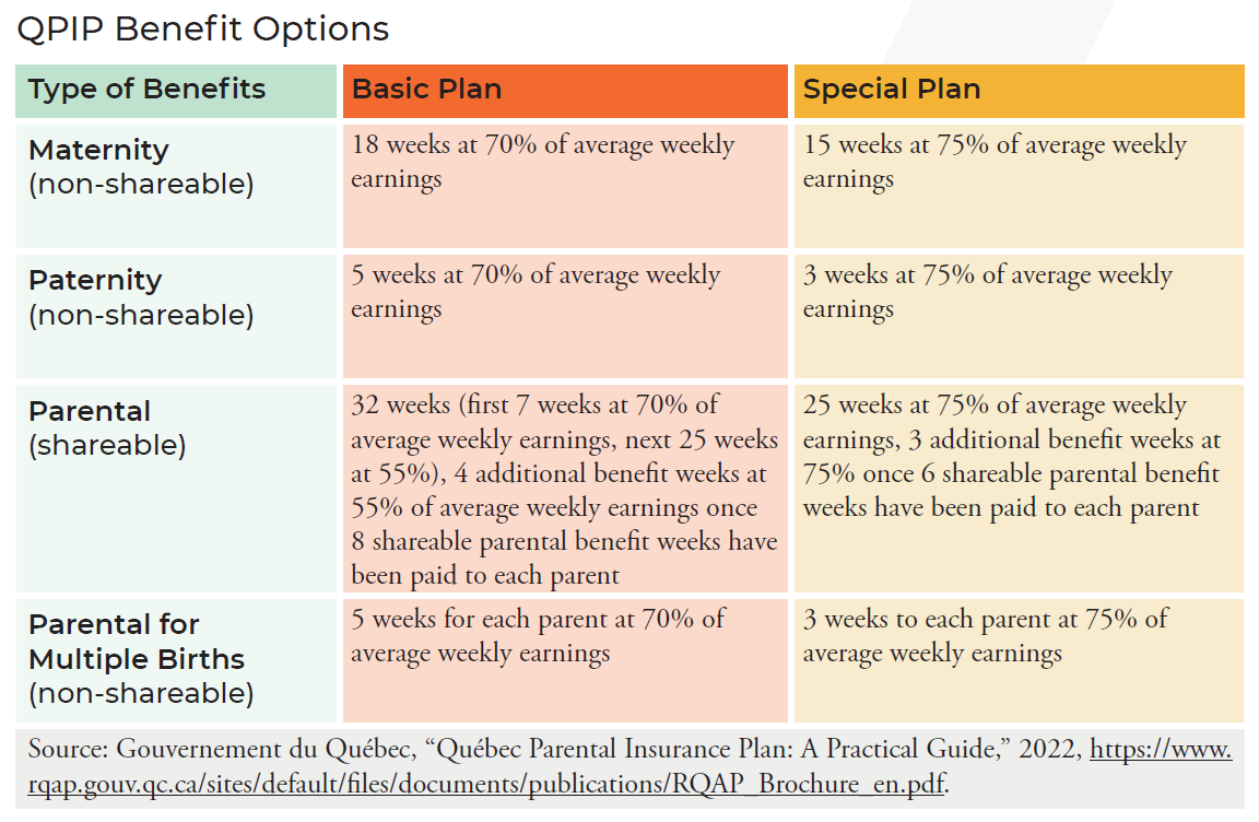 The QPIP offers maternity benefits, paternity benefits for the non-birth parent, sharable parental benefits, and a leave for multiple births. Parents can choose from the basic plan or opt for the special plan. The basic plan allows for up to eighteen weeks of maternity benefits, five weeks for paternity benefits, both at 70 percent of average weekly earnings. The basic plan offers an additional thirty-two weeks of shareable parental benefits. The first seven weeks are paid at 70 percent of earned income, and the final twenty-five weeks at 55 percent. If parents share the benefit with eight weeks of the benefit going to each parent, the family qualifies for an additional four weeks of benefits at 55 percent of earnings.