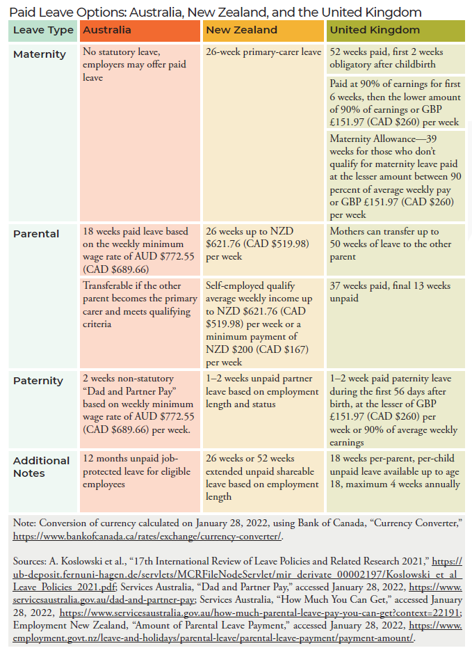 Reviewing parental-benefit policies outside of Canada can provide insight into the strengths and weaknesses of Canadian policies. For the purposes of this backgrounder, we provide a brief overview of parental-leave policies, both paid and unpaid, within Australia, New Zealand, and the United Kingdom.