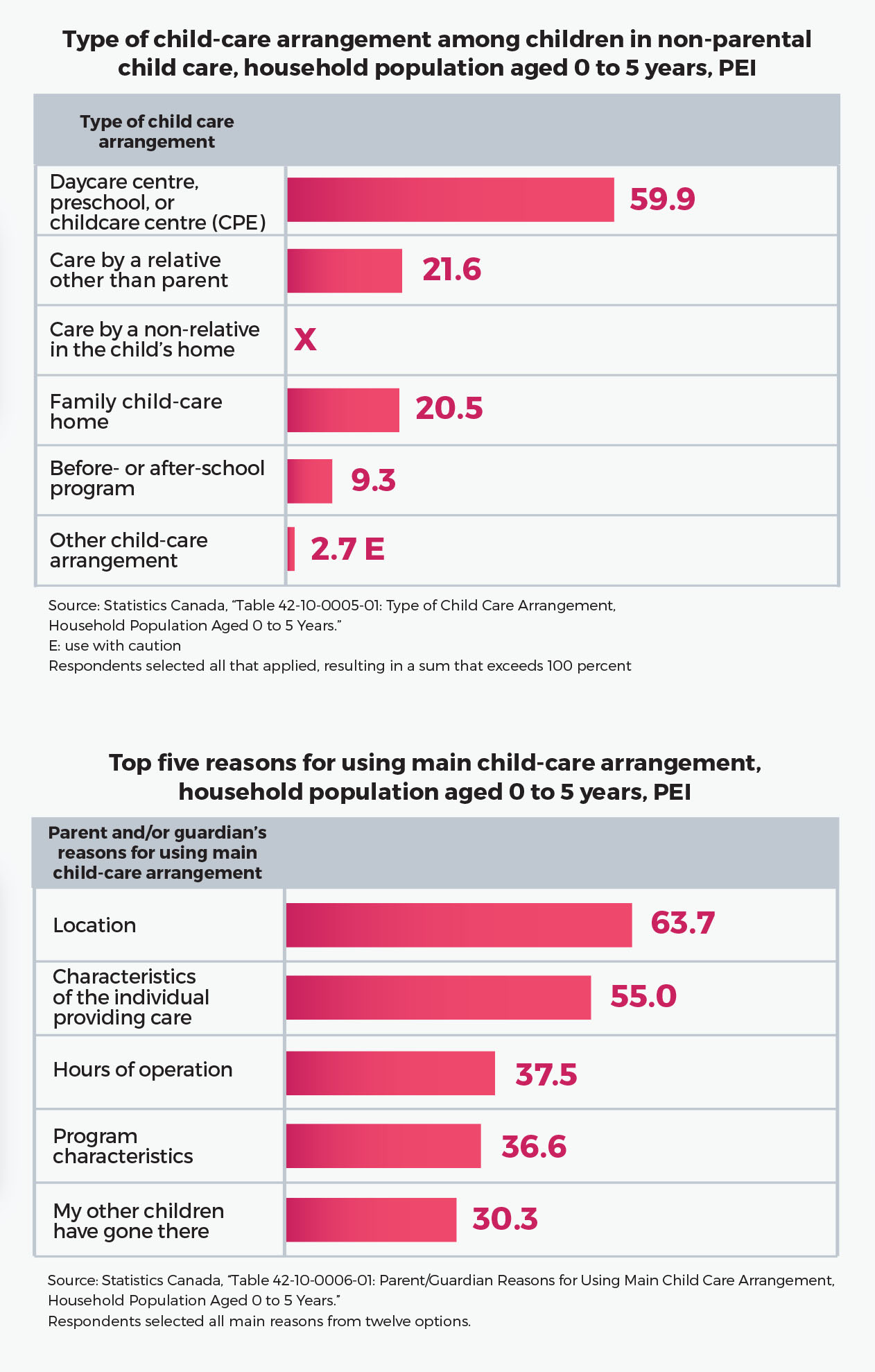 • About 3 percent of PEI children under age six are in parental care because the parent could not find another option. 2 2 Source: Statistics Canada, “Early Learning and Child Care for Children aged 0 to 5 years: A Provincial/Territorial Portrait,” https://www150.statcan.gc.ca/n1/pub/11-626-x/11-626-x2019013-eng.htm.