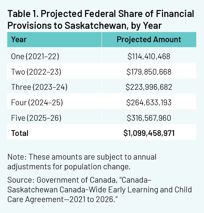 The Agreement allows the province to carry forward up to 60 percent of funding from year one to year two. An amendment dated March 1, 2022 increased the carry-forward allowance to 64 percent. 14 14 Government of Canada, “Agreement to Amend the Canada–Saskatchewan Canada-Wide Early Learning and Child Care Agreement—2021 to 2026,” 2022, https://www.canada.ca/en/early-learning-child-care-agreement/agreements-provinces-territories/saskatchewan-canada-wide-2021/amendment.html.