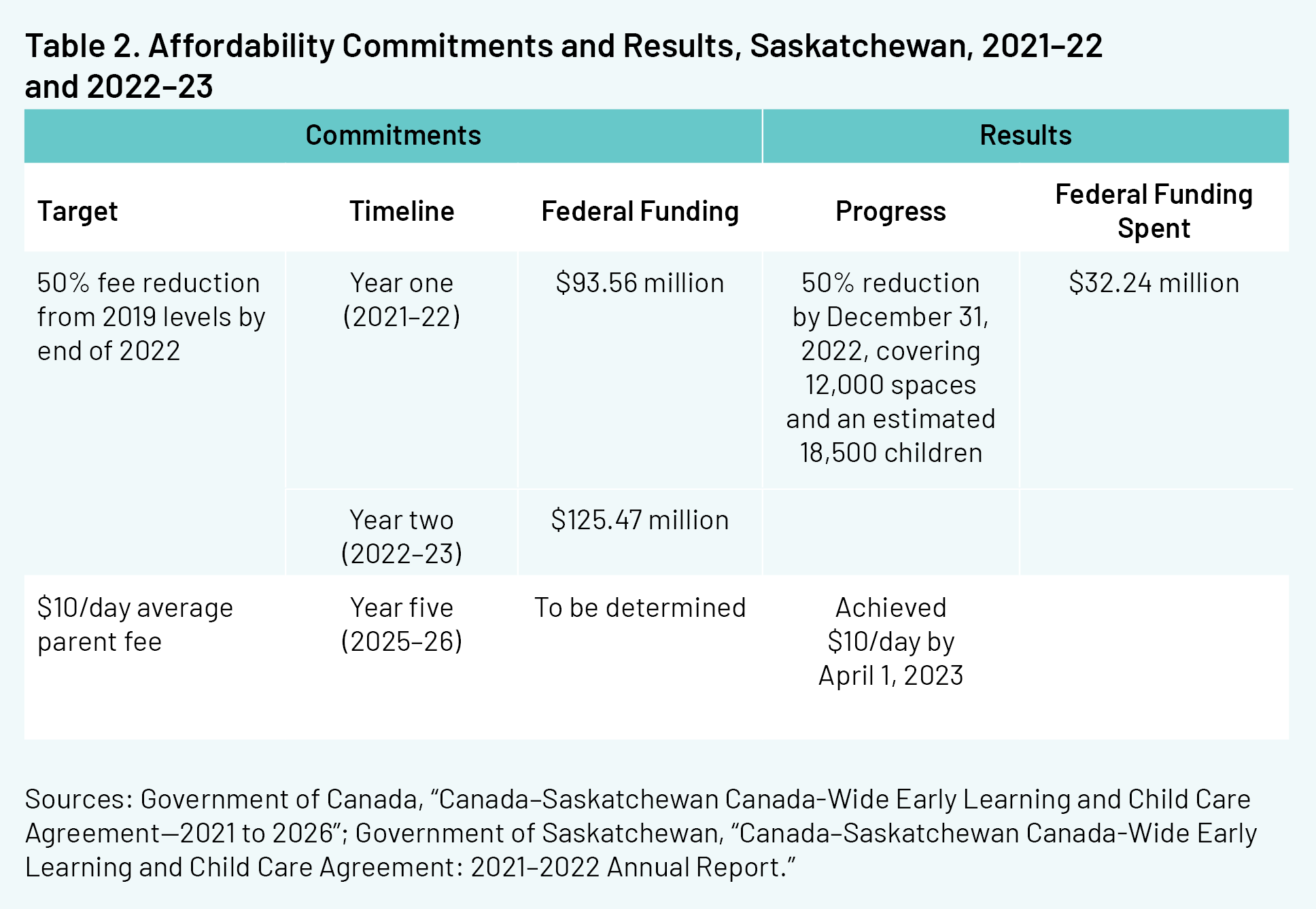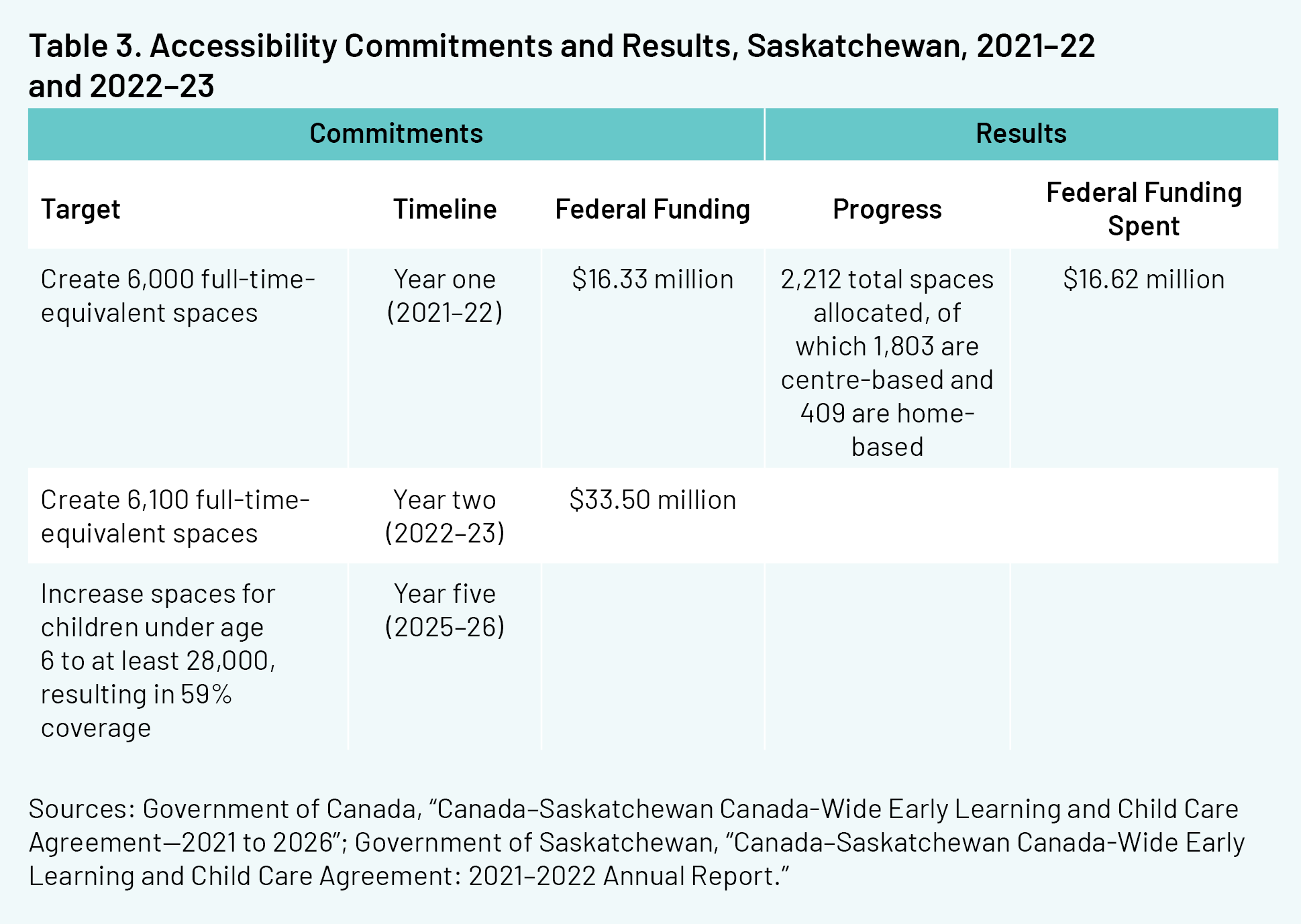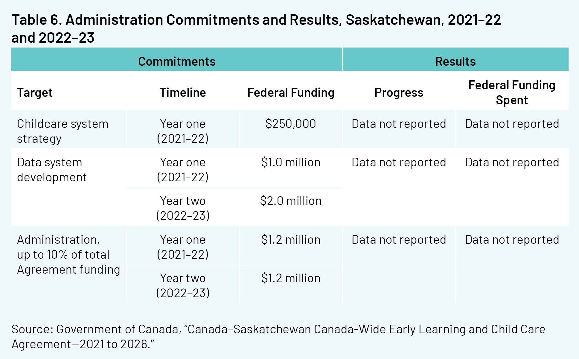 The province should be commended for meeting its obligation to publicly report on the progress under the Agreement, as many provinces and territories have not done so. 3 3 Government of Saskatchewan, “Canada–Saskatchewan Canada-Wide Early Learning and Child Care Agreement: 2021–2022 Annual Report,” 2022, https://pubsaskdev.blob.core.windows.net/pubsask-prod/138630/2021-22%252BAnnual%252BReport%252BCan-Sask%252BELCC%252BAgreement.pdf.