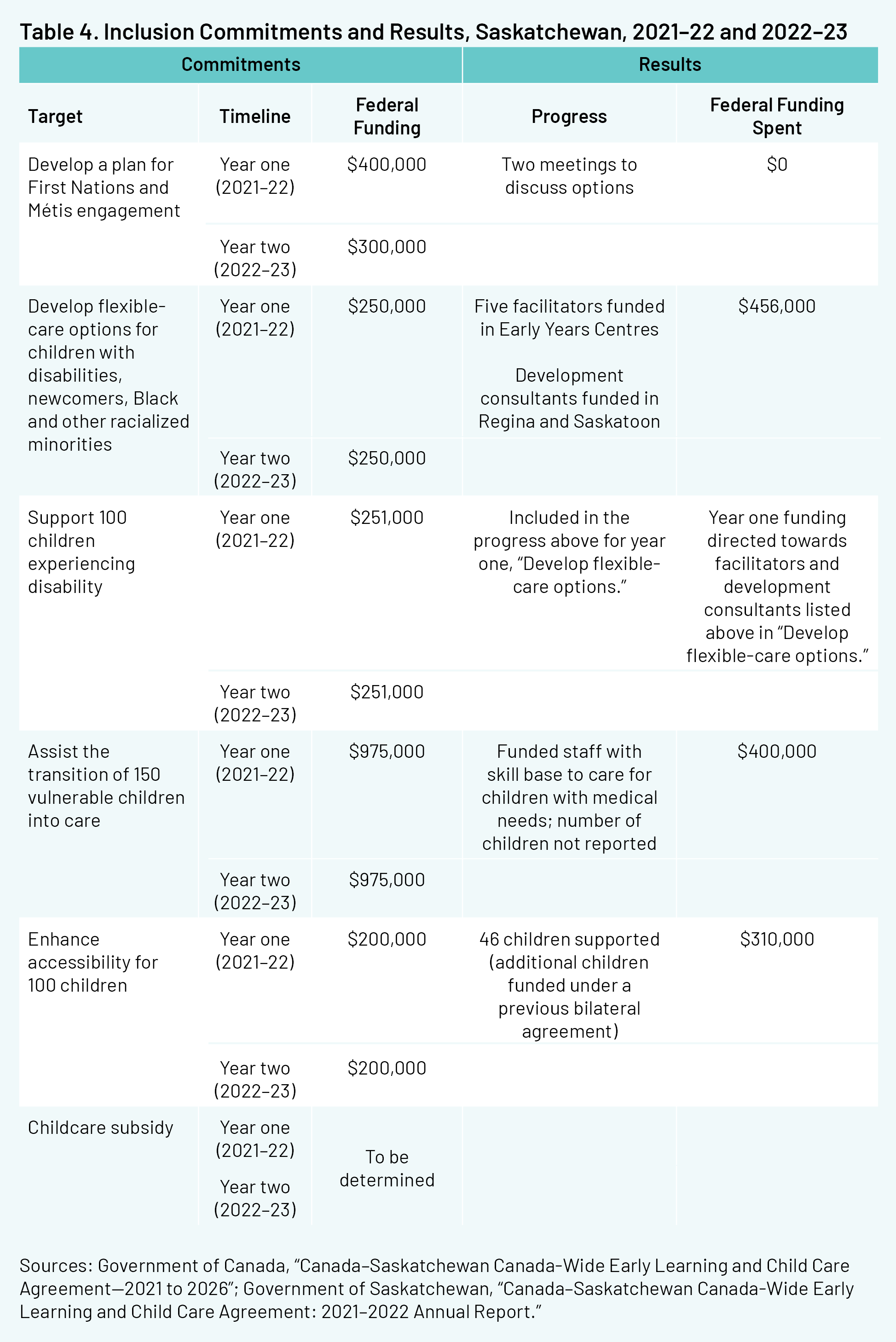 The province overspent by $110,000 to enhance accessibility, reaching 46 percent of its target number of children. Funding was distributed to providers through the Enhanced Accessibility and Inclusion Grants, which are funded from provincial funding, an existing bilateral agreement, and the “Canada–Saskatchewan Canada-Wide Early Learning & Child Care Agreement,” and supported an additional 487 children. According to Ministry of Education annual reports, the province increased the number of Enhanced Accessibility grants by sixteen over the previous year, for a total of 412. An additional two Inclusion grants were provided, for a total of 75. 10 10 Calculations by author from Saskatchewan Ministry of Education, “Annual Report for 2020–21,” 25; Saskatchewan Ministry of Education, “Annual Report for 2021–22,” 22.