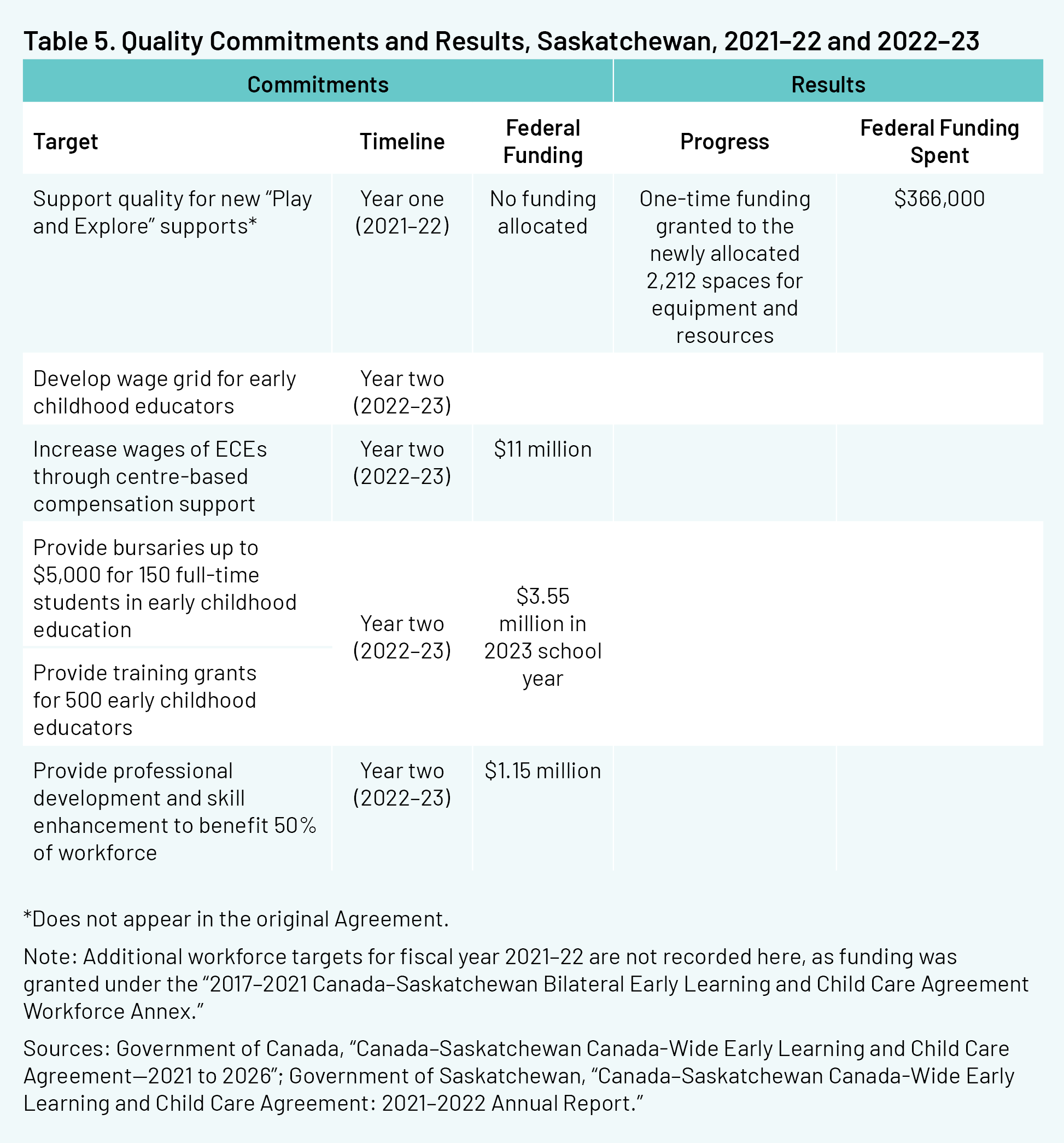 Additional workforce targets for year one are not recorded here, as funding was granted under annex 3 of the “Canada–Saskatchewan Early Learning and Child Care Agreement.” 11 11 Government of Canada, “Canada–Saskatchewan Early Learning and Child Care Agreement,” annex 3.