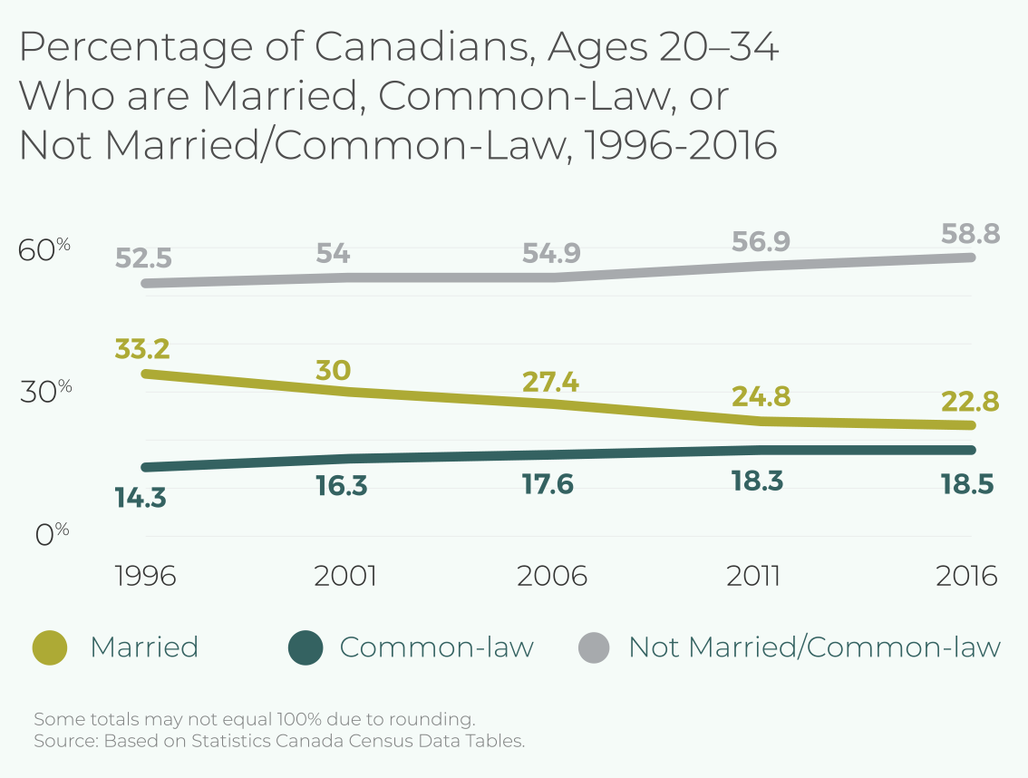 Numerous factors have contributed to the decline in partnering. The pathway to adulthood has become elongated, with young adults reaching the traditional markers of adulthood, such as marriage, children, and home ownership, at later ages. The cost of housing is rising faster than incomes. Many young Canadians are spending longer in school, with increased student debt, but experience uncertain employment prospects. Those with lower educational attainment are even less likely to marry than their peers. One sign of this elongation is that the portion of young adults between the ages of twenty and thirty-four that live with at least one parent has been increasing in every census since 2001. 2 2 “Young Adults Living with Their Parents in Canada in 2016,” Statistics Canada, August 2, 2017, https://www12.statcan.gc.ca/census-recensement/2016/as-sa/98-200-x/2016008/98-200-x2016008-eng.cfm. Disinterest in work and education among some young men may be contributing to this trend, while other young adults face barriers to achieving the stable independence they desire. Economic factors are only one part the equation. Shifting cultural attitudes have reshaped how many young adults approach marriage. Andrew Cherlin, sociologist at Johns Hopkins University, describes that in the past, couples tended to view marriage as the foundation on which to develop other elements of adult life. He argues that couples today frequently view marriage as a capstone, to be entered into once career aspirations and other markers of stability are secured. 3 3 A.J. Cherlin, The Marriage-Go-Round: The State of Marriage and the Family in America Today (New York: Vintage, 2010).