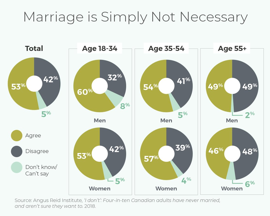 The shift from understanding marriage as a formative relationship to seeing it as an expressive status decreases the importance of marriage for some young adults who consider other options for individual expression. As illustrated in Figure 2, an Angus Reid Institute survey found that 57 percent of eighteen- to thirty-four-year-olds agree that “marriage is simply not necessary.” For many young adults considering their options today, marriage is a “nice to have,” not a necessity.
