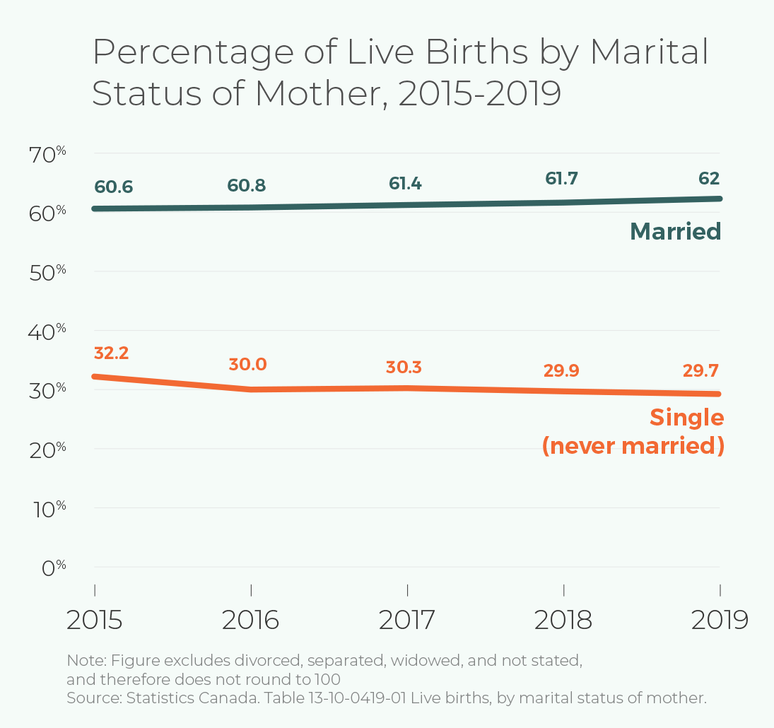 Prior to the pandemic, Canada’s fertility rate was at a historic low. Given that the majority of Canadian children are born into couple families and the majority of these couples are married, reversing this trend toward delayed fertility will be unlikely without a corresponding reversal of the trend toward delayed or forgone partnering and marrying.
