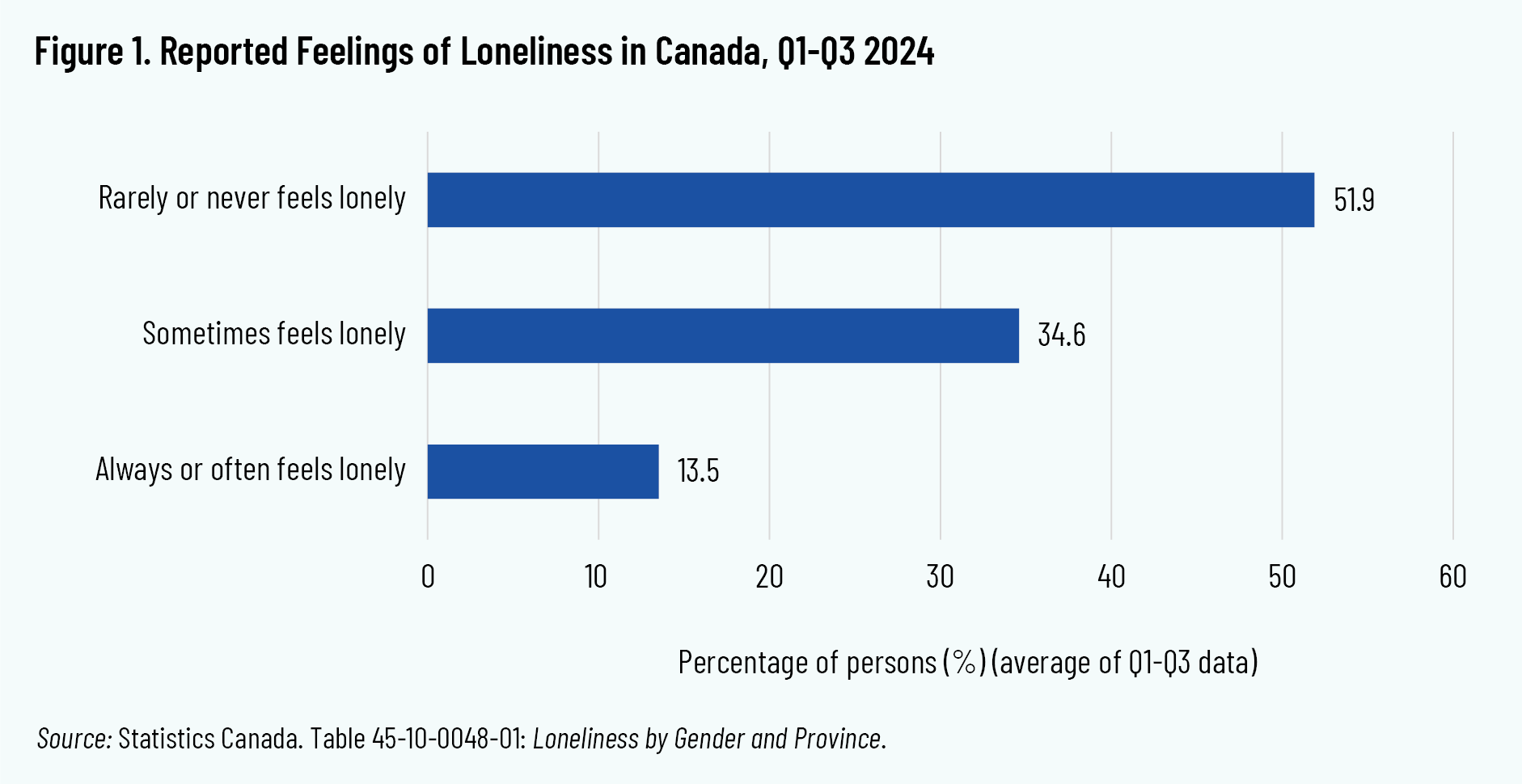 Statistics Canada also conducts periodic surveys on feelings of loneliness in Canada. In 2024, an average of 13.5 percent of Canadians said that they “always or often feel lonely,” compared with 34.6 percent reporting they “sometimes feel lonely,” and 51.9 percent reporting they “rarely or never feel lonely.” 31 31 For 2024, data are provided for each available quarter (Q1, Q2, and Q3) and were used to calculate the average for 2024 in general. Statistics Canada, Table 45-10-0048-01: Loneliness by Gender and Province (2024), https://doi.org/10.25318/4510004801-eng.