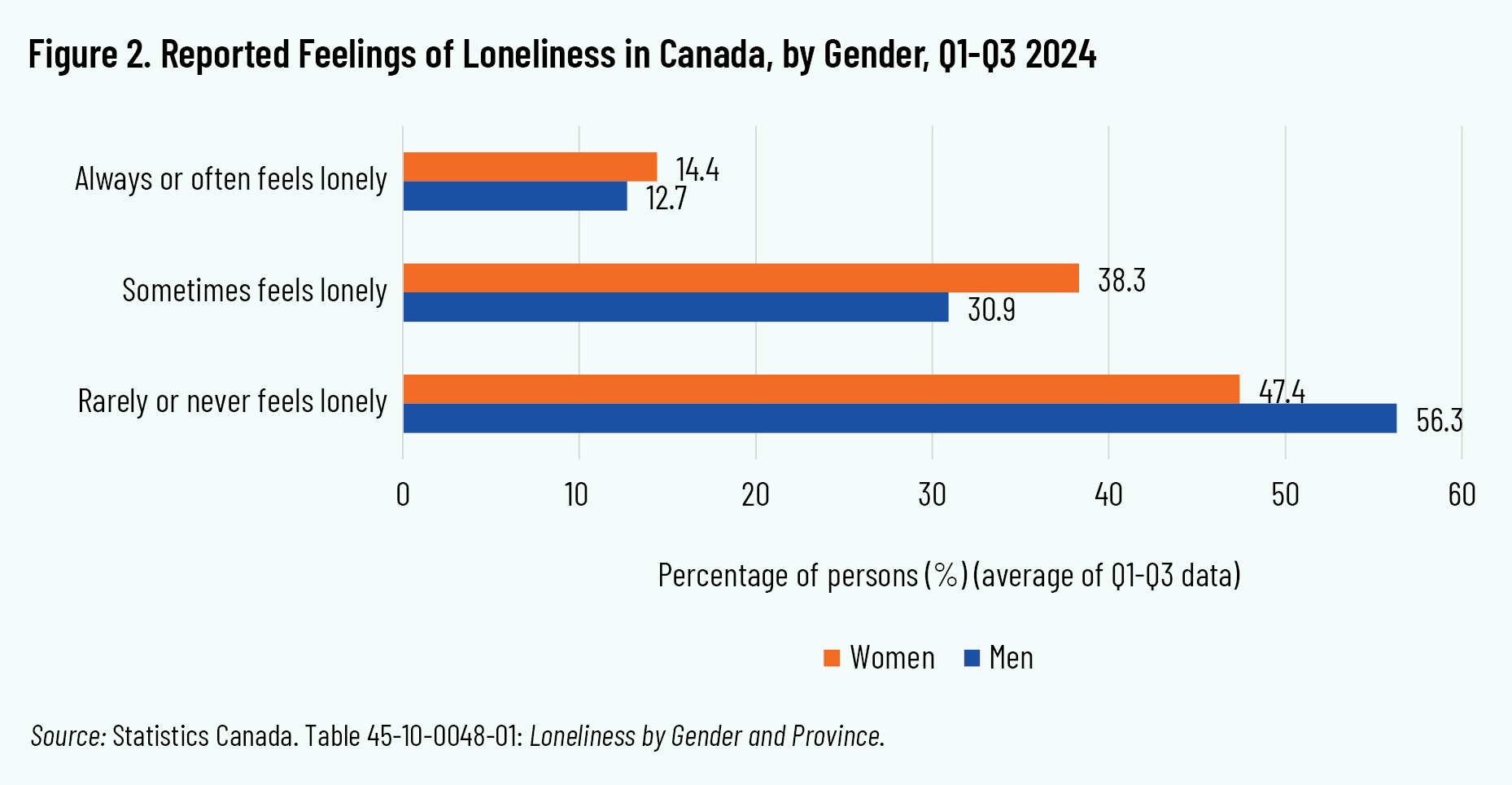 Women report higher levels of loneliness than men, with 14.4 percent of women saying they “always or often feel lonely” and 38.3 percent saying “sometimes,” compared to men with 12.7 percent saying they “always or often feel lonely” and 30.9 percent saying “sometimes.” The percentage of women reporting that they “rarely or never feel lonely” was 47.4 percent, compared to 56.3 percent of men. 32 32 Based on calculating the average from Statistics Canada’s Q1, Q2, and Q3 2024 data. Statistics Canada, Table 45-10-0048-01: Loneliness by Gender and Province.