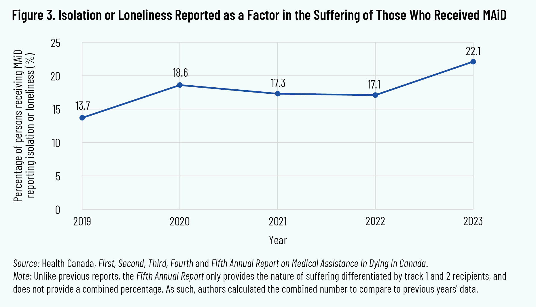Although research has not fully explored the relationship between MAiD and isolation or loneliness, as discussed above, Health Canada reports that a significant—and increasing—number of persons receiving MAiD identify isolation or loneliness as a source of suffering motivating their decision. 46 46 Health Canada, Fifth Annual Report, 31–32. Of note, however, is that multiple sources of suffering can be included by the same patient and no ranking is used, so it is unclear to what extent isolation or loneliness is a primary or secondary factor in their decision to die prematurely.