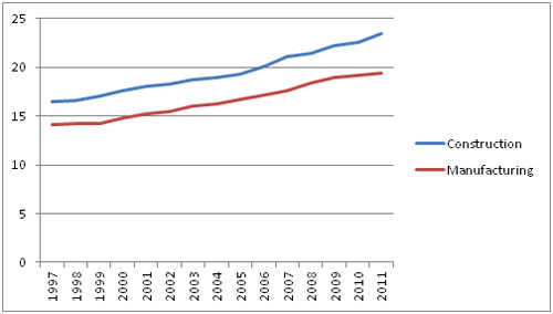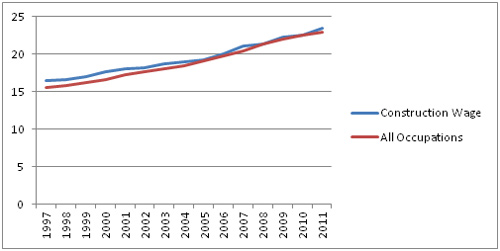 However, less attention is paid to employment in construction, which stands at the crossroads of these two trends. Construction employment cannot, by its nature, be outsourced. While modular construction is a developing trend in the industry, the bulk of construction work must be conducted by workers close to the site of the project. And, while construction wages tend to track almost exactly with the average wage rates for all Canadian occupations, Stats Canada indicates that construction wages track above the average wage of those in manufacturing. 1 1 Stats Canada. Table 282-0069: Labour force survey estimates (LFS), wages of employees by type of work, National Occupational Classification for Statistics (NOC-S), sex and age group, unadjusted for seasonality. http://www5.statcan.gc.ca/cansim/a26?lang=eng&retrLang=eng&id=2820069&paSer=&pattern=&stByVal=1&p1=1&p2=37&tabMode=dataTable&csid= Accessed 26/11/12.