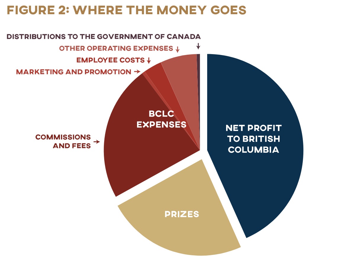 This revenue is destined for many different pots (Figure 2). BCLC’s largest expense is prizes: $764 million was paid out to winners across the province in 2017–18. Commissions and fees—many of which are paid to private-sector businesses such as lottery retailers and facility service providers—were a close second at $723 million. All other operating expenses, such as maintenance, gaming licenses, and ticket printing—totaled $319 million. In accordance with the federal-provincial gambling agreement of 1985, BCLC sends a portion of its profits to Ottawa ($9.8 million in 2018). Everything left over after all these bills have been paid—about a third of total revenue—goes to the province.