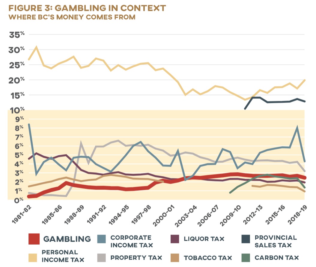 Gambling has become a lucrative source of funds since the first legal lotteries were introduced to the province in 1974. The BC government’s first gambling cheque from the Western Canada Lottery Foundation was for a mere $1.5 million; its most recent gambling cheque from BCLC came in at $1.4 billion. 2 2 BCLC, “2018/19 Annual Service Plan Report.” As the gambling industry has grown in BC, so too has the provincial government’s reliance on it as a source of revenue. Nearly 2.5 percent of public funds in BC are now collected at slot machines, casino tables, and lottery checkout lanes (Figure 3).