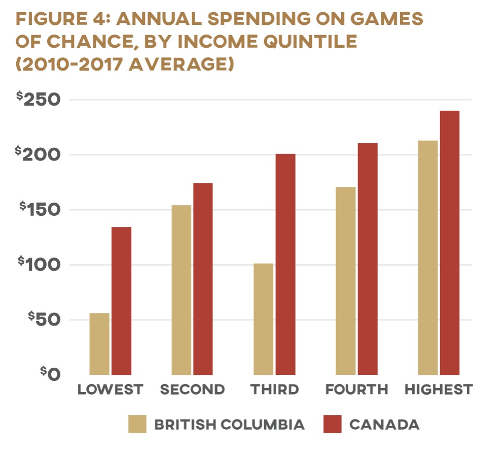 BC’s population is not, however, paying BCLC equally. The regressive nature of gambling revenue is hard to see on the surface. The data collected by Statistics Canada’s Survey of Household Spending (SHS) seem to show that those who have more money are more likely to gamble and to spend more money when they do: the average household in Canada’s highest income quintile spent $240 on gambling each year, while the average lowest-quintile household spent a mere $134. 5 5 Author’s calculations based on data from Statistics Canada, “Table 11-10-0223-01: Household Spending by Household Income Quintile, Canada, Regions and Provinces,” https://www150.statcan.gc.ca/t1/tbl1/en/tv.action?pid=1110022301. Limited data were available at the provincial level, so national-level data are used. While very limited data are available for BC, a similar pattern emerges: highest-quintile households report spending $213, while those in the lowest quintile report spending only $56 (Figure 4). 6 6 Since only one data point was available for lowest-quintile households in BC, this figure should be treated with caution.