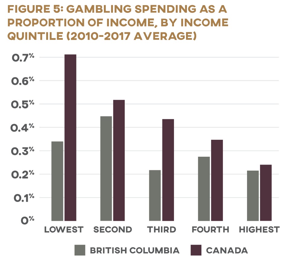 But first glances can be deceptive. Higher earners may be spending more of their paycheques at the casino, but gambling eats up a much higher proportion of the poor’s income (Figure 5). According to SHS data from 2010–17, households in Canada’s highest-income quintile spend an average of 0.24 percent of their after-tax earnings on games of chance each year; those in the lowest quintile spent nearly three times as much, at 0.71 percent. BC’s poorest households spent more than half again as much of their income on gambling as did the richest (0.34 percent compared to 0.22 percent according to available data). 7 7 All figures are author’s calculations based on data from Statistics Canada’s Canada Income Survey and Survey of Household Spending. See appendix 1 for details. Statistics Canada, “Household Spending”; User Guide to the Survey of Household Spending, 2015 (Ottawa: Income Statistics Division, 2017), https://www150.statcan.gc.ca/n1/en/catalogue/62F0026M2017001; Statistics Canada, “Table 11-10-0193-01: Upper Income Limit, Income Share and Average of Adjusted Market, Total and After-Tax Income by Income Decile,” https://www150.statcan.gc.ca/t1/tbl1/en/tv.action?pid=1110019301.