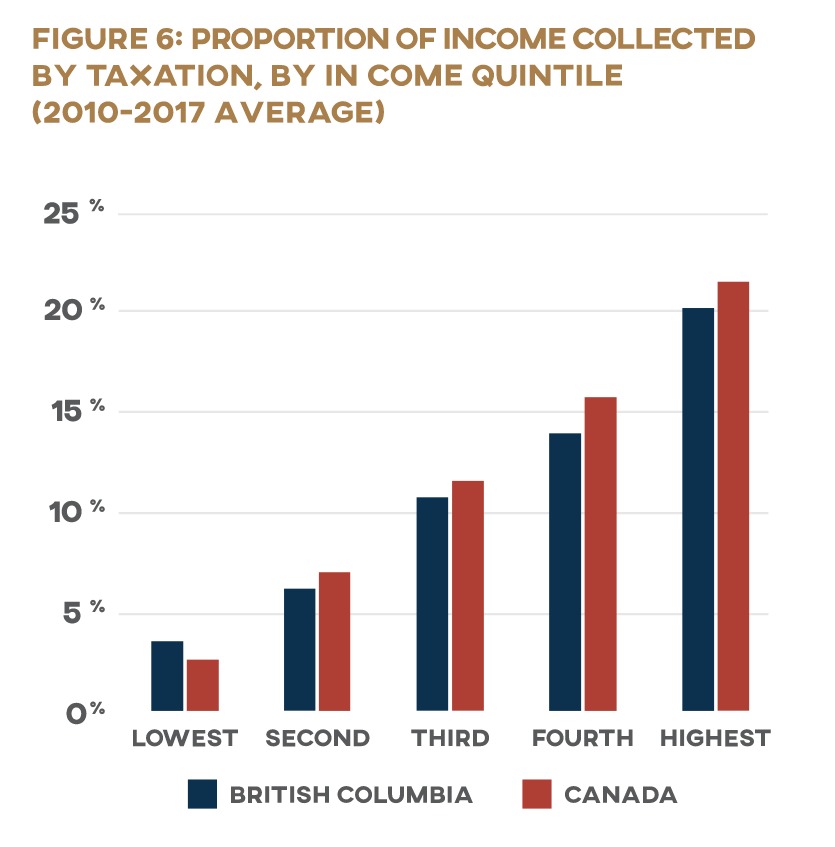 The regressive nature of gambling taxes is no secret: research both within Canada and internationally has consistently found that poor households spend a greater percentage of their income on gambling than their wealthier neighbours do. 8 8 See, e.g., MacDonald, McMullan, and Perrier, “Gambling Households in Canada”; Jon D. Wisman, “State Lotteries: Using State Power to Fleece the Poor,” Journal of Economic Issues (Association for Evolutionary Economics) 40, no. 4 (December 2006): 955–66; Jim Orford et al., “The Role of Social Factors in Gambling: Evidence from the 2007 British Gambling Prevalence Survey,” Community, Work & Family 13, no. 3 (August 2010): 258; Thijs Bol, Bram Lancee, and Sander Steijn, “Income Inequality and Gambling: A Panel Study in the United States (1980–1997),” Sociological Spectrum 34, no. 1 (January 2014): 64; K. Brandon Lang and Megumi Omori, “Can Demographic Variables Predict Lottery and Pari-Mutuel Losses? An Empirical Investigation,” Journal of Gambling Studies 25, no. 2 (June 2009): 173; Sari Castrén et al., “The Relationship Between Gambling Expenditure, Sociodemographics, Health-Related Correlates and Gambling Behavior—A Cross-Sectional Population-Based Survey in Finland,” Addiction 113, no. 1 (2018): 91–92. And yet this is exactly the opposite of how other tax revenue functions. Our progressive tax system is designed to tax the rich more heavily than the poor: those who have more pay more. The lowest-income quintile in BC loses barely 3.5 percent of its total income to federal and provincial income tax, while the average household in the province’s highest-income quintile turns over to the government nearly six times more of its total income, at 20 percent. (Figure 6) 9 9 Author’s calculations based on data from Statistics Canada, “Upper Income Limit.”