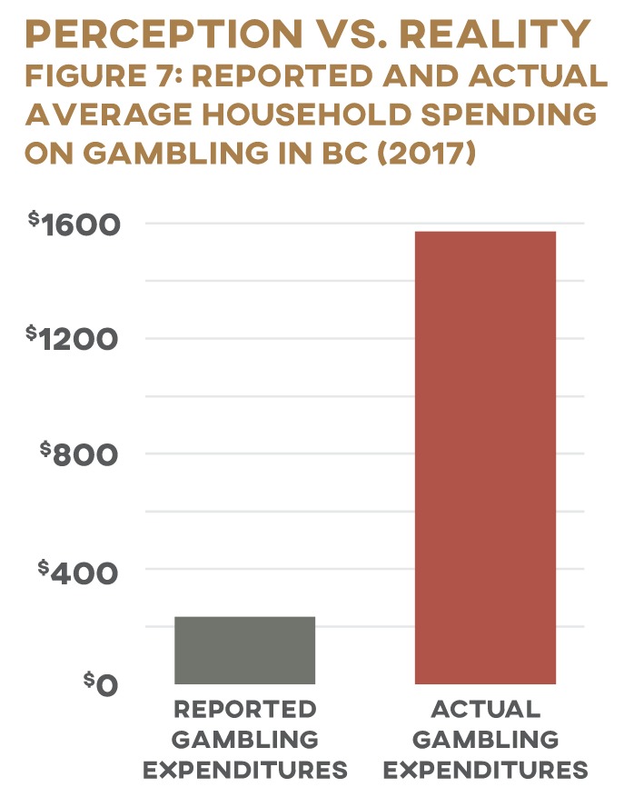 Statistics Canada’s data on spending and income across the country provide a window into the relationship between gambling and household earnings. But these figures are not without their limitations. As with other addictions, most of us don’t want to admit we have a problem—but we’re gambling more than we think. According to the SHS, the average BC household spent $234 on games of chance in 2017. Multiply this figure by the number of households in BC that year (2.0 million 10 10 Statistics Canada, “Table 36-10-0101-01: Distributions of Household Economic Accounts, Number of Households, by Income Quintile and by Socio-demographic Characteristic,” https://www150.statcan.gc.ca/t1/tbl1/en/cv.action?pid=3610010101#timeframe. ), though, and the provincial population’s total gambling spending comes to only $476 million—a mere 15 percent of BCLC’s recorded revenue that year ($3.2 billion 11 11 BCLC, “2016/17 Annual Service Plan Report,” https://www.bcbudget.gov.bc.ca/Annual_Reports/2016_2017/pdf/agency/bclc.pdf. Figures adjusted for inflation. ). Put another way, the average BC household would have to have gambled close to $1,600 in 2017 for BCLC’s books to balance. And yet the match between self-reported and actual revenue in 2017 was better than usual: the average match between BCLC earnings and SHS expenditure data was only 10.5 percent from 2010 to 2016. This inconsistency is not uncommon: people typically underestimate how much they actually spent gambling in self-reported household expenditure surveys, often dramatically (Figure 7). 12 12 Robert T. Wood and Robert J. Williams, “‘How Much Money Do You Spend on Gambling?’ The Comparative Validity of Question Wordings Used to Assess Gambling Expenditure,” International Journal of Social Research Methodology 10, no. 1 (2007): 63–77.
