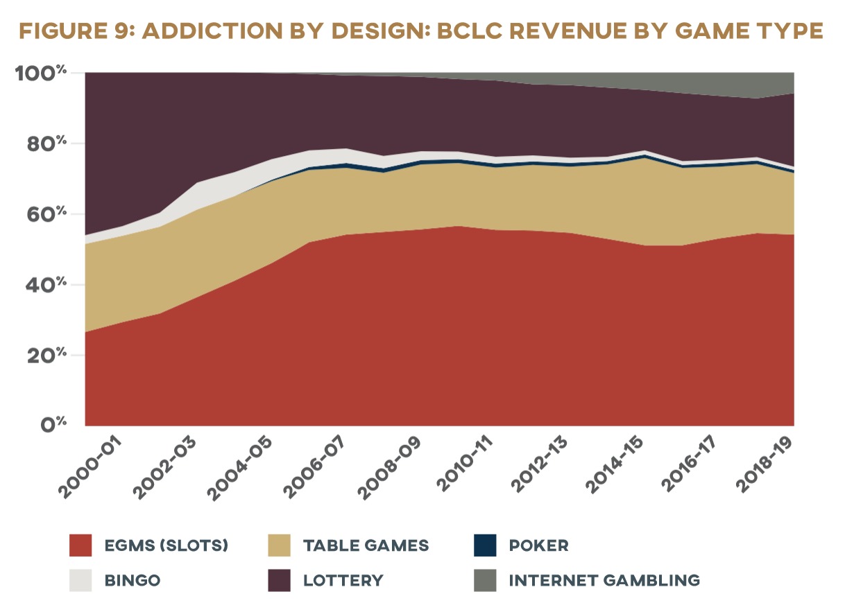 One of the most consistent correlates of problem gambling is game type: those who report gambling on electronic gambling machines (EGMs, usually known as slot machines when found inside casinos and video lottery terminals, or VLTs, when found in other venues like pubs and bars) have a much higher risk of problem gambling than gamblers who report never playing EGMs. 20 20 https://www2.gov.bc.ca/assets/gov/sports-recreation-arts-and-culture/gambling/gambling-in-bc/reports/rpt-rg-prevalence-study-2014.pdf, R.J. Williams, Y.D. Belanger, and J.N. Arthur, “Gambling in Alberta: History, Current Status, and Socioeconomic Impacts,” final report to the Alberta Gaming Research Institute, Edmonton, Alberta, April 2, 2011, 105, https://prism.ucalgary.ca/handle/1880/48495. These machines have faced particular scrutiny for their addictive design. 21 21 Natasha Dow Schüll, Addiction by Design: Machine Gambling in Las Vegas (Princeton: Princeton University Press, 2012), discussed in Matthew Crawford, “Autism as a Design Principle: Gambling,” in The World Beyond Your Head: On Becoming an Individual in an Age of Distraction (New York: Farrar, Straus and Giroux, 2015), 89–112. EGMs have provocatively been described by some researchers as “the crack cocaine of gambling” (Nicki Dowling, David Smith, and Trang Thomas, “Electronic Gaming Machines: Are They the ‘Crack-Cocaine’ of Gambling?,” Addiction 100 [2005]: 33–45), though Dowling et al. conclude that despite the consistent association between EGMs and “the highest level of problem gambling” in the literature, the empirical evidence available at time of writing was insufficient to definitively “establish the absolute ‘addictive’ potential of EGMs” (42). See also Vance Victor MacLaren, “Video Lottery Is the Most Harmful Form of Gambling in Canada,” Journal of Gambling Studies 32, no. 2 (June 2016): 459–85; Gambling Research Exchange Ontario, “Slots and VLTs,” https://www.greo.ca/en/topics/slots-and-vlts.aspx; Centre for Addiction and Mental Health, “About Slot Machines,” https://www.problemgambling.ca/gambling-help/gambling-information/about-slot-machines.aspx; John Rosengren, “How Casinos Enable Gambling Addicts,” The Atlantic, December 2016, https://www.theatlantic.com/magazine/archive/2016/12/losing-it-all/505814/. EGMS are built with features that impair players’ rational control, such as losses disguised as wins—where audio and visual effects celebrate a player “winning” an amount less than he or she wagered, even though the player lost money—and near misses, where the display of symbols makes it appear that the player was close to winning even though the outcome of each play is completely random. These structural characteristics manipulate players’ emotional and cognitive perceptions of the game to keep them playing longer and spending more. 22 22 Charles Livingstone, “How Electronic Gambling Machines Work,” 2, https://aifs.gov.au/agrc/sites/default/files/publication-documents/1706_argc_dp8_how_electronic_gambling_machines_work.pdf; see also K.A. Harrigan et al., “Research Briefing Note: Summary of the Effect and Regulation of Electronic Gaming Machine Near Misses and Losses Disguised As Wins (LDWs) on Players,” Gambling Research Exchange, April 29, 2016, https://www.greo.ca/Modules/EvidenceCentre/Details/research-briefing-note-summary-effect-and-regulation-electronic-gaming-machine-near-misses; Harrigan, “Gap Analysis: Structural Characteristics of EGMs as Indirect Risk Factors for Problem Gambling Versus the Gaming Regulations,” Ontario Problem Gambling Research Centre, 2007, https://www.greo.ca/Modules/EvidenceCentre/files/Harrigan%20(2007)Gap_analysis_Structural_char; C. Jensen et al., “Misinterpreting ‘Winning’ in Multiline Slot Machine Games,” International Gambling Studies 13, no 1 (2012): 112–26, DOI:10.1080/14459795.2012.717635. Even though VLTs are illegal in BC, the province still generates just over half (51 percent) of its gambling revenue from EGMs (slot machines) in casinos and community gaming centres (Figure 8). If half of the province’s gambling tax is collected by machines designed to override players’ conscious control, can this tax really be called “voluntary”?