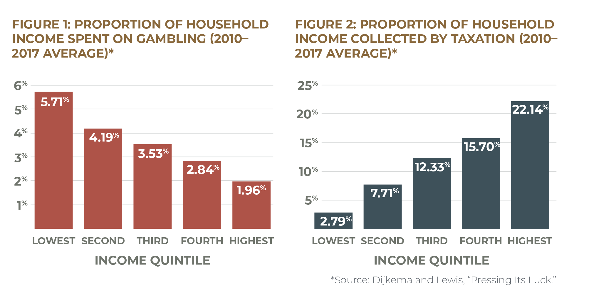 As noted in Cardus’s major study on provincial gambling policy in Canada, 1 1 Dijkema and Lewis, “Pressing Its Luck”; Dijkema and Lewis, Royally Flushed. gambling profits are treated just like tax revenues. Yet there is a significant difference in the way that these two types of revenue sources are collected, and in the burden that they place on citizens. Income and sales taxes are carefully designed to ensure that the poor shoulder a lighter tax burden than those with more: the proportion of income collected in income taxes from the wealthiest quintile is nearly ten times higher than that collected from the poorest quintile, and low- to moderate-income taxpayers receive regular rebates from the government to prevent their being disproportionately affected by sales taxes. Gambling, however, is a regressive revenue source—that is, relative to income it taxes the poor more heavily than the rich. Households in Canada’s lowest income quintile spend an average of 5.7 percent of their income on gambling each year. This is nearly three times the rate paid by the country’s highest-quintile households (see Figures 1 and 2). 2 2 Author’s calculations based on data from Statistics Canada, “Table 11-10-0193-01,” and Statistics Canada, “Table 11-10-0223-01.” For details on calculation methodology, see Dijkema and Lewis, “Pressing Its Luck.” Meanwhile, between 15 and 50 percent of gambling revenue comes from problem gamblers, even though they make up only 1–4 percent of the population (see Figure 7). 3 3 Williams and Wood, “What Proportion of Gambling Revenue”; Alberta Gambling Research Institute, “Adult Prevalence Studies of Problem Gambling.” Estimates of problem gambling prevalence can vary by jurisdiction and the way that problem gambling is defined and measured in a given study.