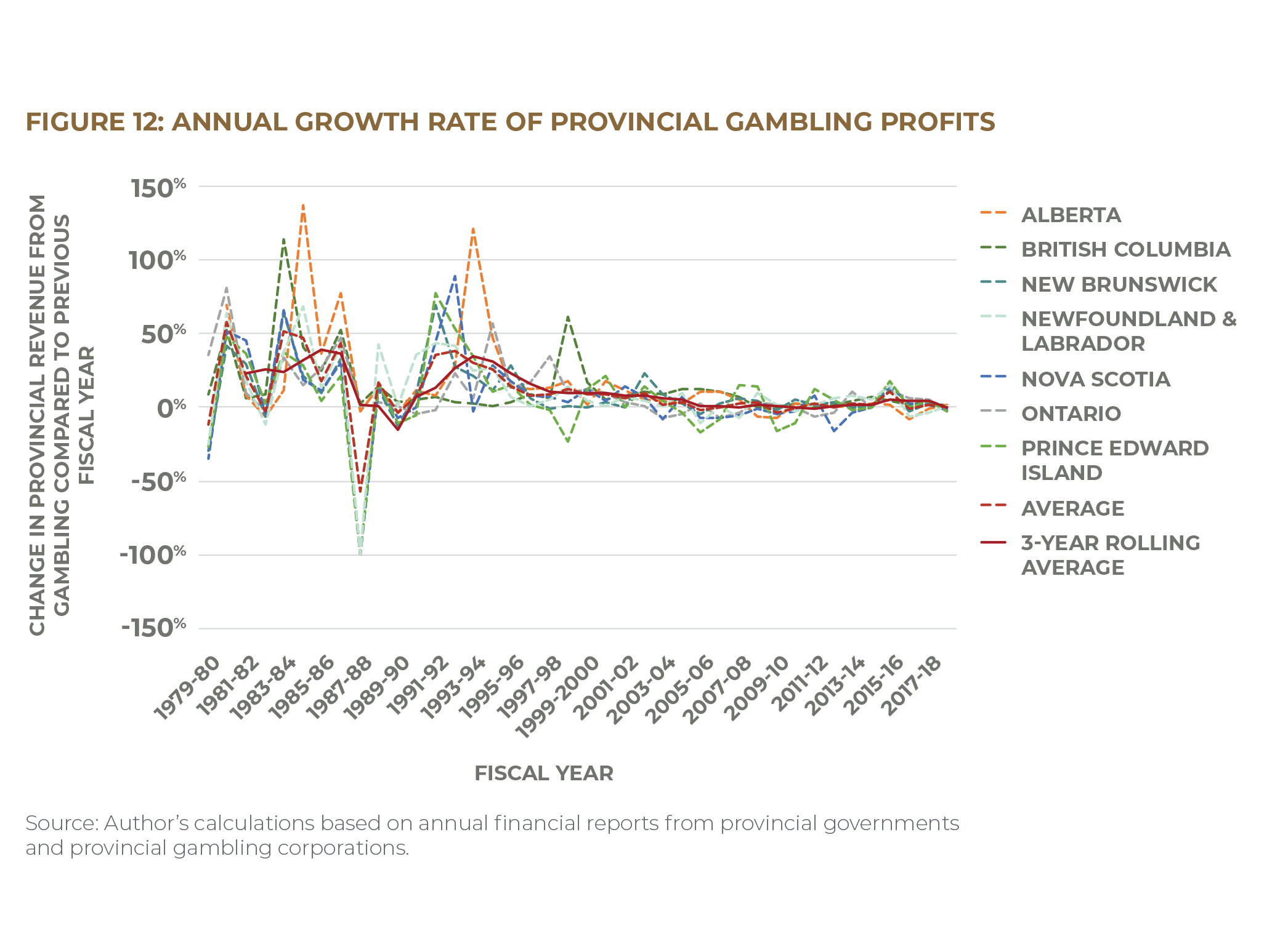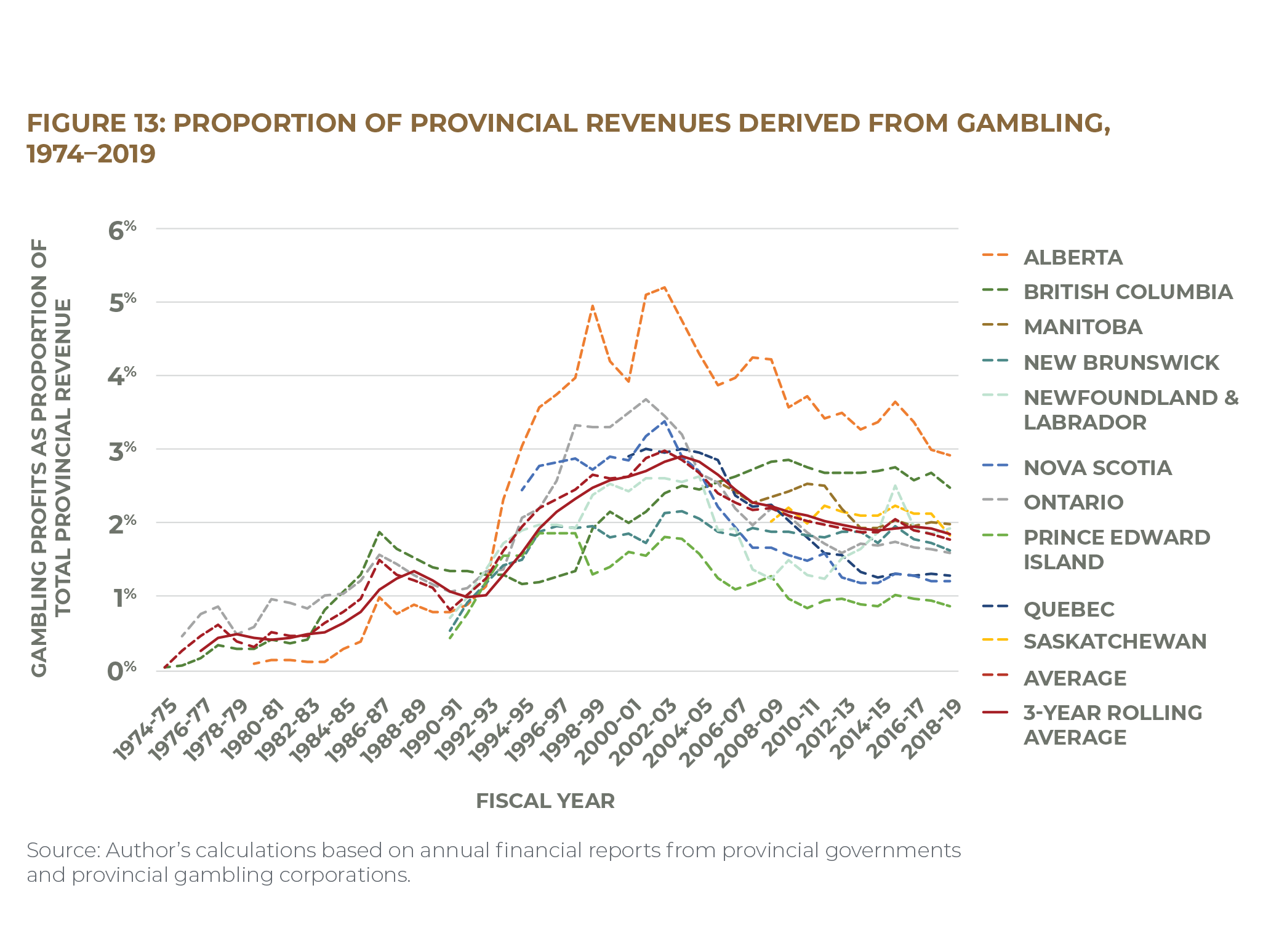 Funnelling gambling dollars into the provincial treasury is an easy way for governments to get a quick infusion of cash, but is not a sustainable source of revenue in the long term. Encouraging Ontarians to gamble more just moves the province’s money around, circulating citizens’ dollars rather than directing them toward value-added production. 223 223 See, e.g., Baxter, “Why Expanding Casinos in Ontario Is a Big Gamble”; Frank, “Casinos a Lazy Way to Deal with Economic Issues”; see also Institute for American Values, “An American Declaration on Government and Gambling.” Gambling’s reliance on the appetite of local populations also raises the risk of diminishing returns as the consumer base loses interest. While the early years of gambling legalization saw the newly legal industry expand rapidly, the growth in provinces’ gambling revenue has slowed dramatically since the late 1990s as the novelty of casinos wore off (see Figures 12 and 13). 224 224 See also Dadayan, “Are States Betting on Sin?”; Dadayan, “State Revenues from Gambling.” Recent research has found that gambling participation in Canada has declined from nearly four-fifths (77.2 percent) in 2002 to around two-thirds (66.2 percent) in 2018. (Meanwhile, gambling revenue per Canadian adult has remained stable over the same period, meaning that the spending per gambler has increased.) 225 225 Williams et al., “Gambling and Problem Gambling in Canada 2018.” Lotteries, for example, have been experiencing a demographic-driven decline in sales, with millennials buying fewer tickets than older generations. Ontario Lottery and Gaming’s market research has found that adults younger than thirty-five are less than half as likely as the average Ontarian to be a “current player,” that is, to have bought a lottery ticket in the past two months (15 percent compared to 38 percent). In contrast, adults older than fifty-five play the lottery at a significantly higher rate than the provincial average, with nearly half (46 percent) of that age group classified as a current player. 226 226 Ontario Lottery and Gaming, “Lottery Players Fact Sheet”; see also Jones, “Lotteries Struggle to Attract Millennial Players.”