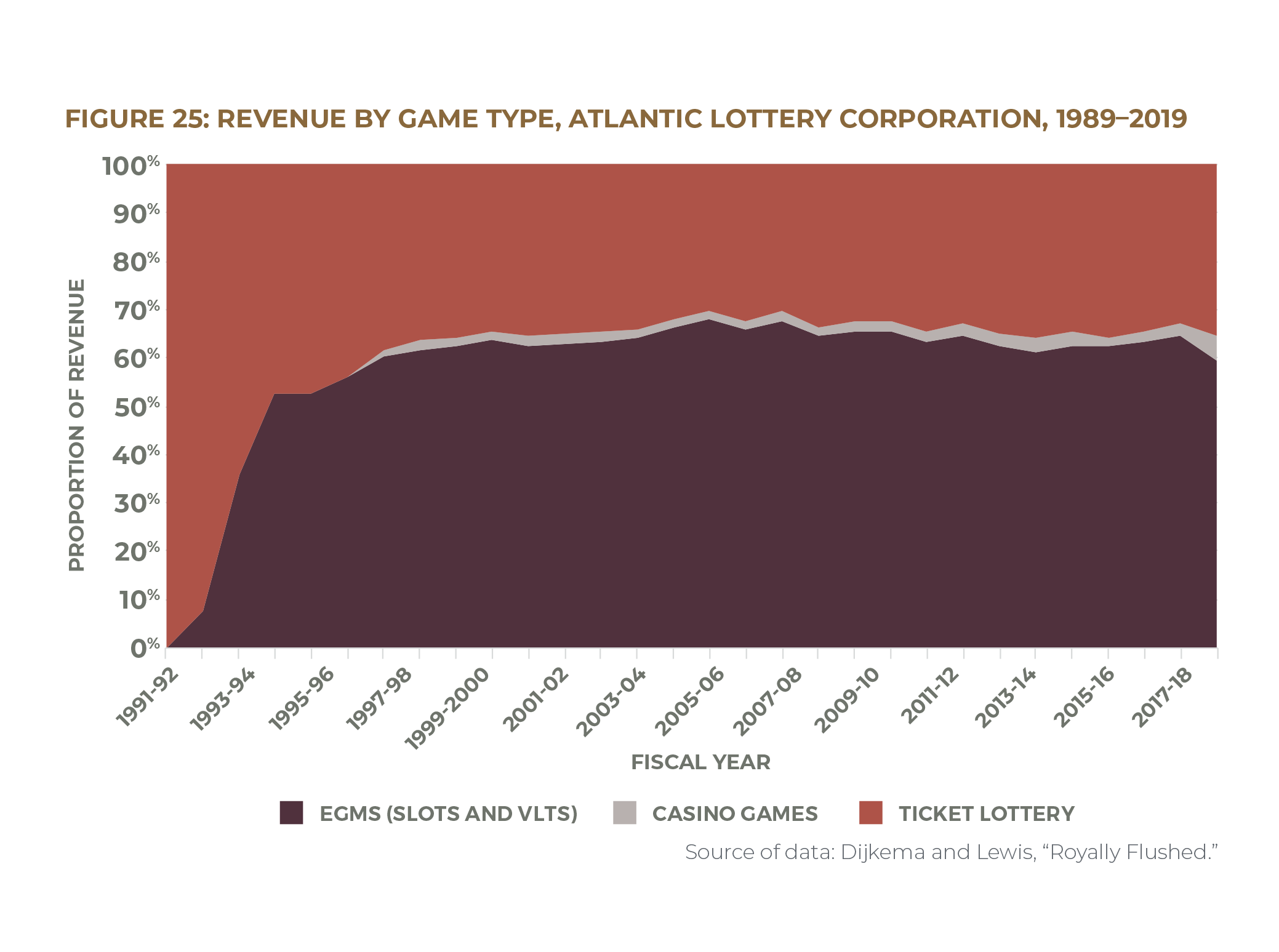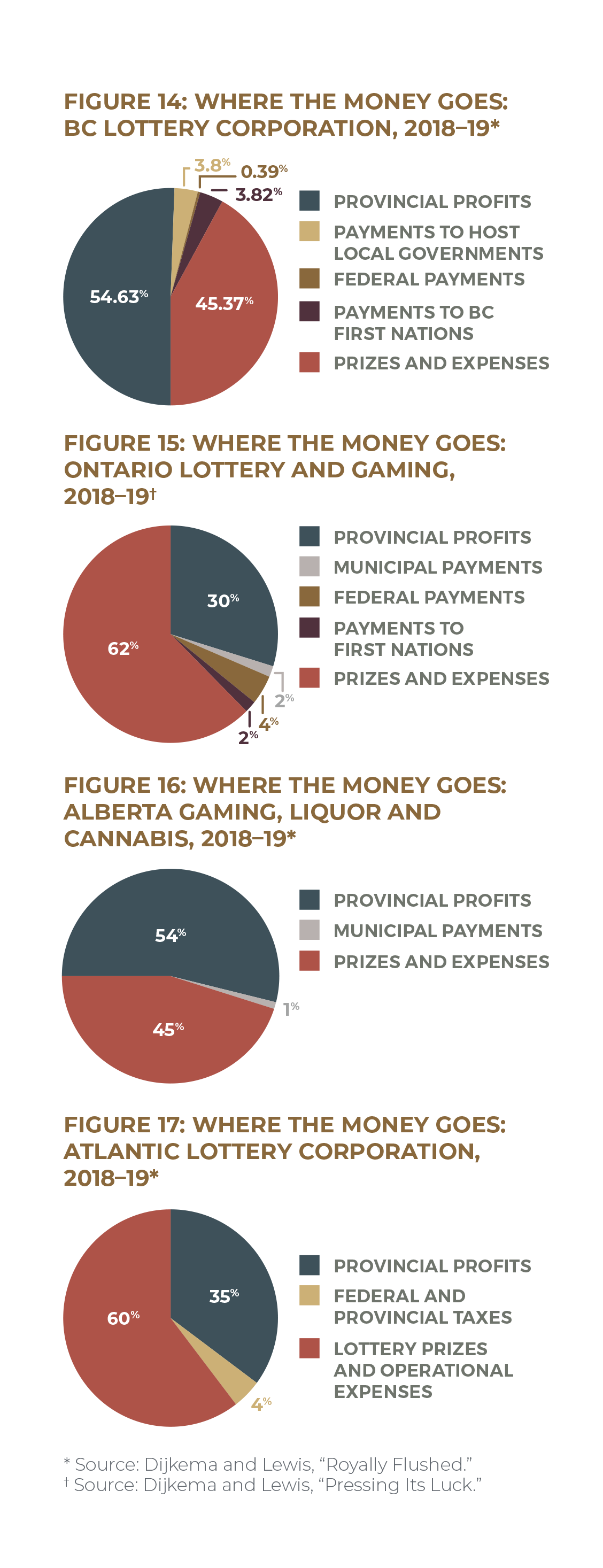 Lotteries and casinos are also a highly inefficient way for the government to generate revenue. Provinces and other levels of government—including federal, municipal, and First Nations—get barely half the money that leaves gamblers’ pockets: in the 2018–19 fiscal year, the proportion of gambling revenue sent to governments totaled 38 percent in Ontario, 40 percent in Atlantic Canada, and 55 percent in Alberta and British Columbia (see Figures 14 through 17). 227 227 Author’s calculations based on data from British Columbia Lottery Corporation, “2018/19 Annual Service Plan Report”; Alberta Gaming, Liquor and Cannabis Corporation, “Annual Report 2018–19”; Ontario Lottery and Gaming, “Annual Report 2018–19”; ALC, “Annual Report 2018–19.” The rest of the money goes to operating expenses and to lottery prizes—wealth skimmed from the pockets of the many, to be concentrated in the hands of the very, very few. As recent reporting has pointed out, the past few years have seen Ontario Lottery and Gaming’s profits fall even as revenue rises, raising questions about Ontario Lottery and Gaming Corporation executives’ compensation. 228 228 See Lilley, “OLG Boss Sets the Tone”; Lilley, “OLG Bosses Cash In Big”; Lilley, “OLG Prez on His Way Out.” Of course, as leaders of a multi-billion-dollar organization, members of the corporation’s executive team are exactly the kind of experienced and capable professionals Ontario would need to restructure its gambling system toward saving; their skills and expertise would be better spent building the wealth of individuals rather than funnelling ever more revenue to the state.