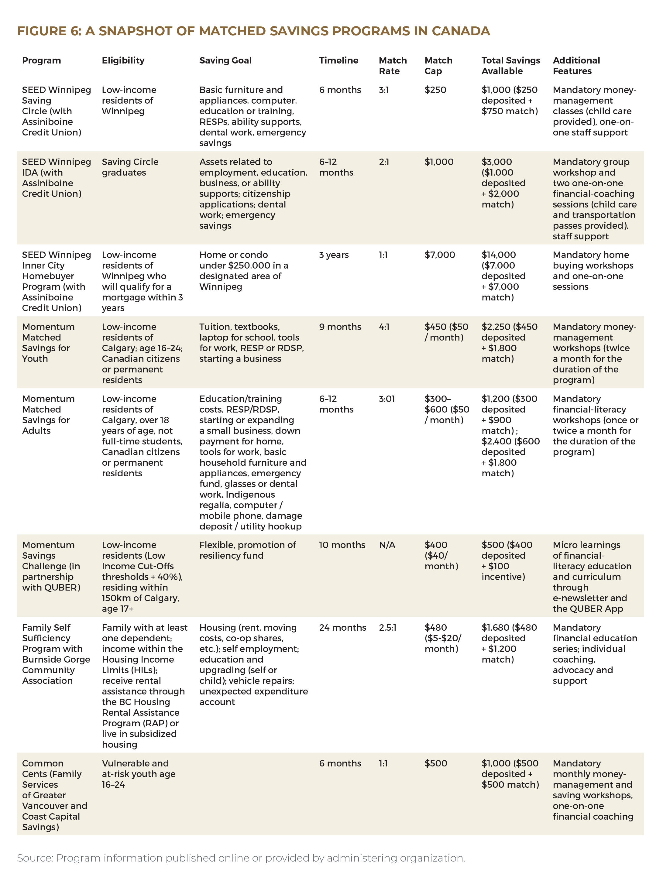 IDAs or similar matched savings accounts are also available in certain parts of Canada, where they are offered by non-profit organizations including SEED Winnipeg (Saving Circle, 72 72 SEED Winnipeg, “Saving Circle”; SEED Winnipeg, “Saving Circle Booklet.” IDA, 73 73 SEED Winnipeg, “Individual Development Account”; SEED Winnipeg, “IDA Booklet.” Inner City Homebuyer Program 74 74 SEED Winnipeg, “Inner City Homebuyer Program.” ), Momentum Calgary (Matched Savings for Youth, formerly Youth Fair Gains 75 75 Momentum, “Matched Savings for Youth”; Peariso, “Youth Fair Gains.” ; Matched Savings for Adults 76 76 Momentum, “Matched Savings for Adults.” ; Savings Challenge 77 77 Information provided by Momentum. ), Burnside Gorge Community Association (Family Self Sufficiency Program 78 78 Information provided by Burnside Gorge Community Association. An additional asset-development opportunity exists for those living in subsidized non-profit housing. If their household income increases (and rent goes up) during the program, an escrow savings program will kick in: the difference between their rent rate at the start of the program and the higher rent rate will be set aside by the subsidy provider until the end of the three-year program, up to a cap of $7,500. Not all participants will be eligible for this program as rents do not often change. ), and Family Services of Greater Vancouver (Common Cents 79 79 Family Services of Greater Vancouver, “Coaching and Workshops.” Saving goal not specified. ), often in partnership with credit unions such as Vancity, 80 80 Vancity, “Savings and Investments.” Assiniboine, 81 81 Assiniboine Credit Union, “Asset Building Programs.” and Coast Capital Savings (see Figure 6).