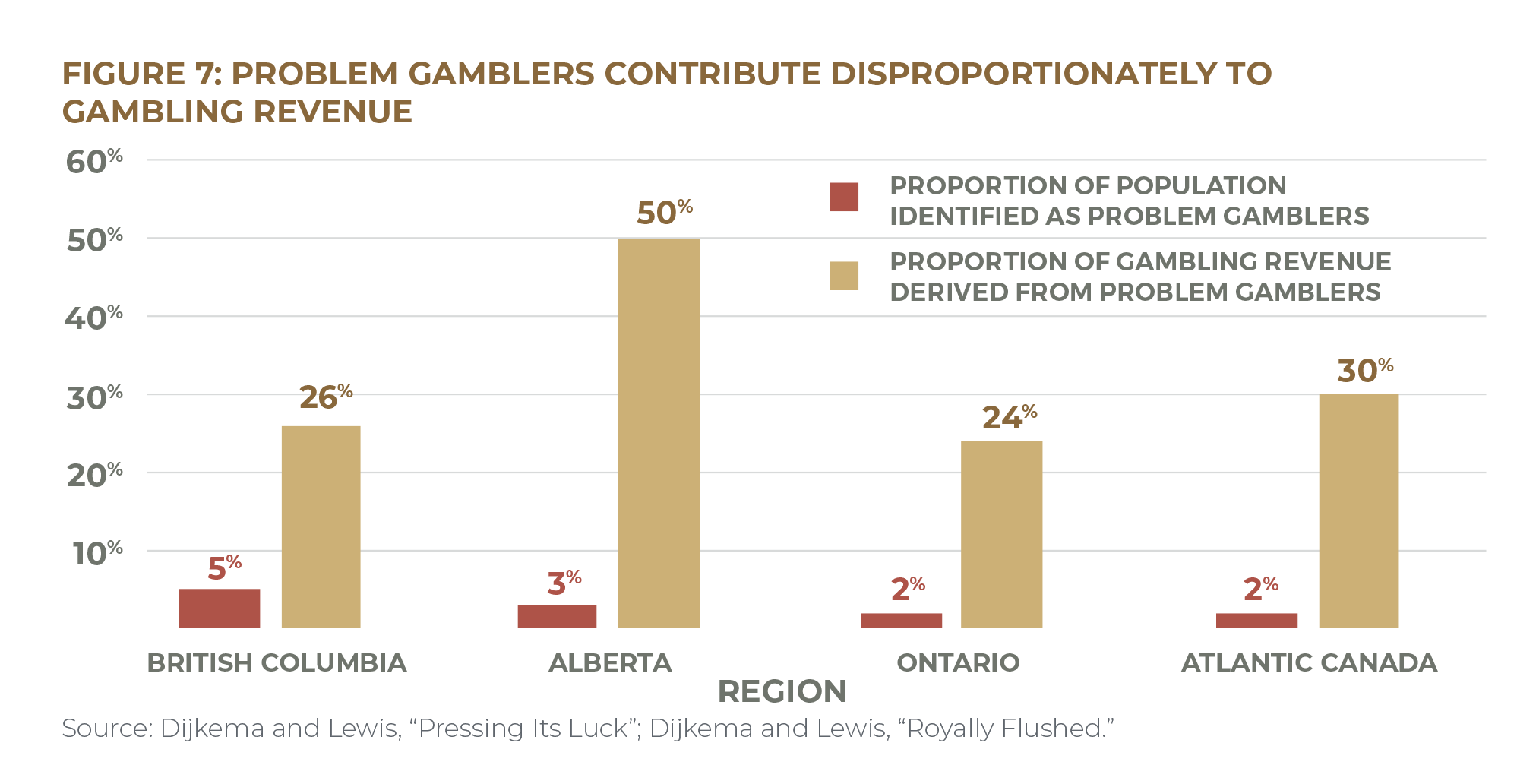 Though those classified as having a gambling problem make up a very small proportion of the population in any given province, they are responsible for a large share of gambling revenue. In Ontario, problem gamblers make up 1–2 percent of the population and contribute up to 24 percent of gambling revenue; in British Columbia, 4–5 percent contribute up to 26 percent; in Alberta, 2–3 percent contribute up to 50 percent; and in the Atlantic provinces, 1–2 percent contribute up to 30 percent (see Figure 7). 212 212 Williams and Volberg, “Gambling and Problem Gambling in Ontario”; British Columbia Provincial Health Officer, “Lower the Stakes”; Williams, Belanger, and Arthur, “Gambling in Alberta”; Williams and Wood, “What Proportion of Gambling Revenue.”