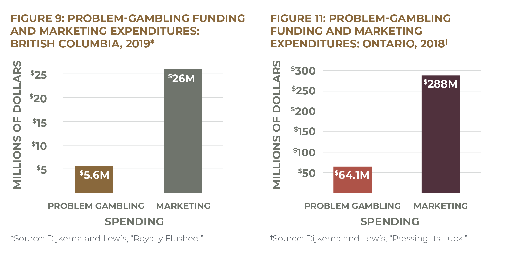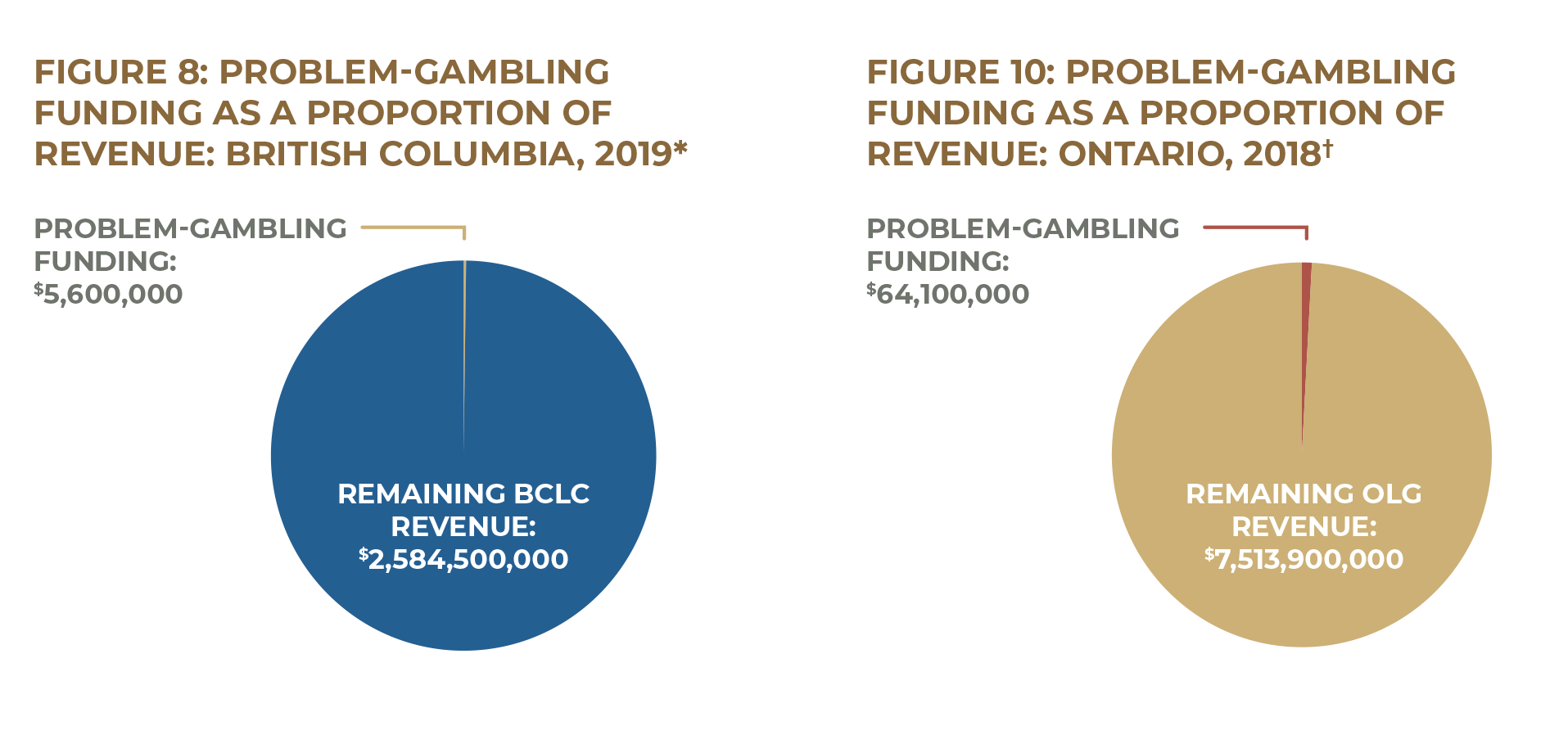 Yet the budgets of provincial gambling corporations suggest that provinces’ priorities are skewed heavily in favour of marketing—that is, encouraging people to gamble more—rather than prevention and treatment of problem gambling. In 2018, the Ontario Lottery and Gaming Corporation spent $282 million on marketing and promotion but only $64 million on problem-gambling prevention and treatment: $45 million was directed to the Ontario Ministry of Health and Long-Term Care, as per a policy that earmarks 2 percent of gross slot-machine revenue for problem gambling, and $19 million was devoted to its own Responsible Gambling program. 213 213 Ontario Lottery and Gaming, “OLG Annual Report 2017–18”; see also Dijkema and Lewis, “Pressing Its Luck.” Due to a change in financial reporting practices, these figures were not available for 2018–19 or 2019–20, the most recent reports available at time of writing. In other words, Ontario Lottery and Gaming is spending four and a half times as much on marketing as it does on gambling addictions. The same pattern is true in BC: the British Columbia Lottery Corporation dedicated just $5.6 million to responsible gambling strategies in 2019, but spent $26 million—nearly five times more—on advertising, marketing, and promotions. Put in context of these two corporations’ total annual revenues, Ontario Lottery and Gaming and British Columbia Lottery are spending on problem-gambling mitigation just 0.8 percent and 0.2 percent, respectively, of the money they make each year ($7.5 billion and $2.6 billion) (see Figures 8 through 11). 214 214 British Columbia Lottery Corporation, “2018/19 Annual Service Plan Report”; British Columbia Lottery Corporation, “Where the Money Goes.”