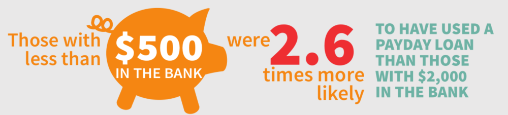 The Urban Institute, for example, found that a buffer of just $250–$749 makes families less vulnerable to hardship in the face of income loss. 27 27 McKernan et al., “Thriving Residents, Thriving Cities.” After controlling for other characteristics, households with $500 or less in liquid savings in their bank accounts are 2.6 times more likely to use payday loans than households with $2,000 to $8,000 in the bank. 28 28 Dijkema and McKendry, “Banking on the Margins,” 20; Pyper, “Payday Loans,” 8. Yet many Canadians are struggling to build up even a small buffer of emergency savings. In 2015, 29 percent of Canadians reported that their emergency savings would last a month or less. Almost half (44 percent) said that they had $5,000 or less in emergency savings. And 46 percent of Canadians said the lack of an emergency savings fund, either past or present, caused their debt to increase. 29 29 Bank of Montreal, “BMO Rainy Day Survey.”